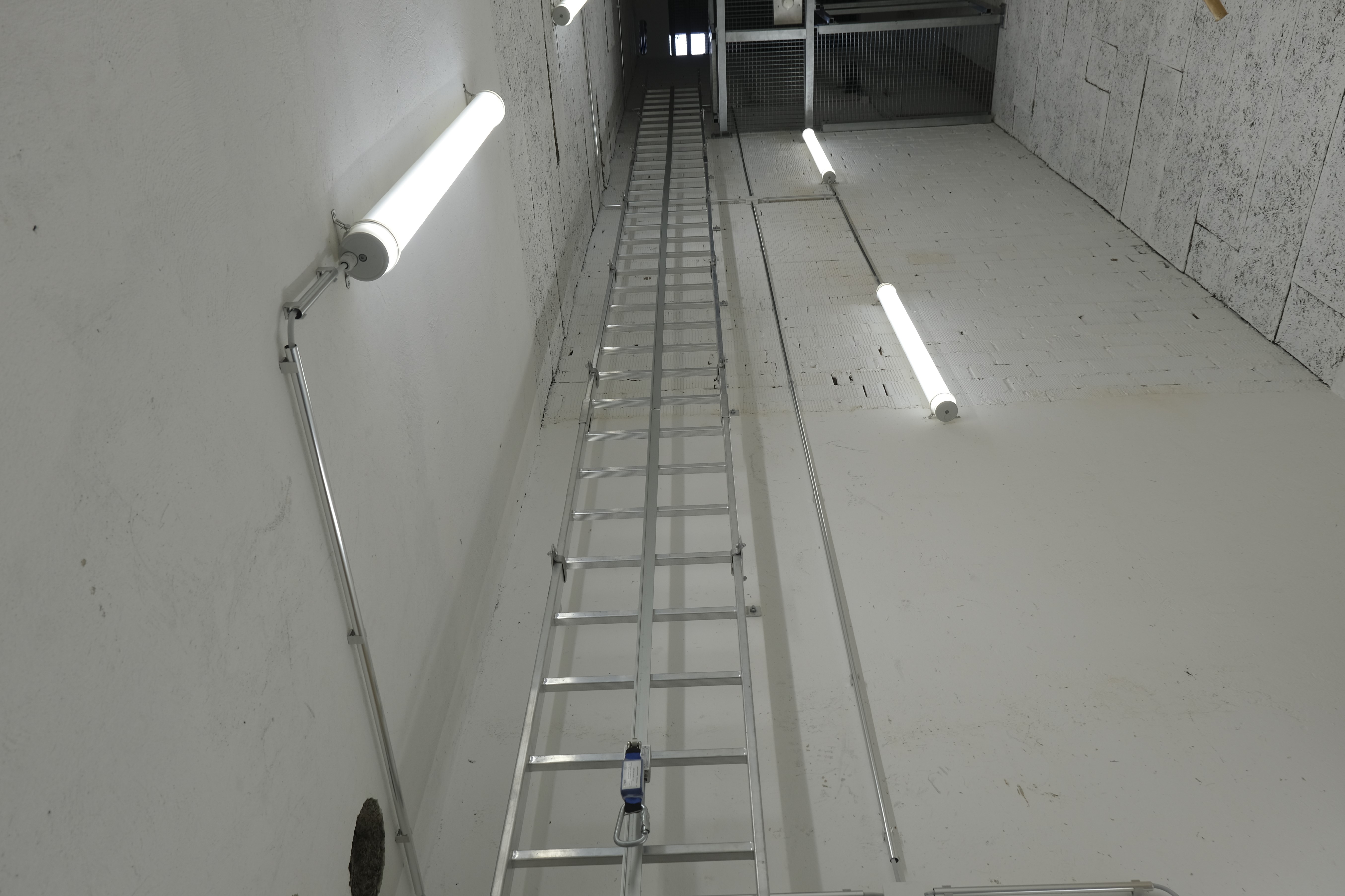 An der wandmontierten Leiter trainieren Einsatzkräfte das sichere Arbeiten in der Höhe. Auf mehreren Stockwerken können Auf- und Abstiege sowie Rettungsszenarien geübt werden. Dabei werden Steig- und Sicherungstechniken unter praxisnahen Bedingungen gefestigt.