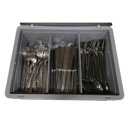 Das 60er Set Essbesteck wird in einem geschlossenen Kunsstoffbehälter bereitgestellt.