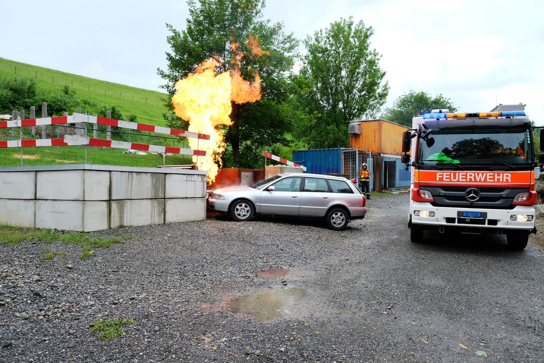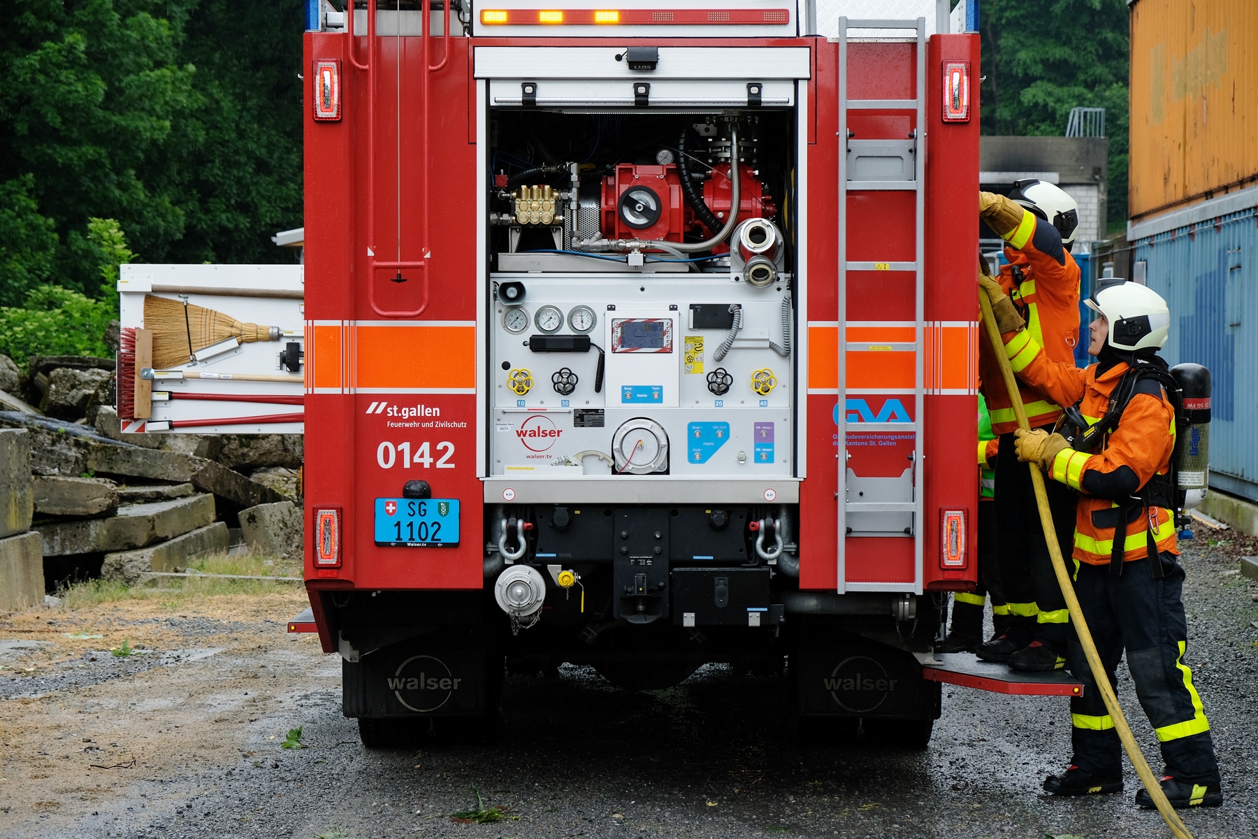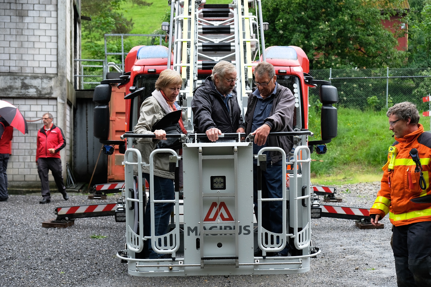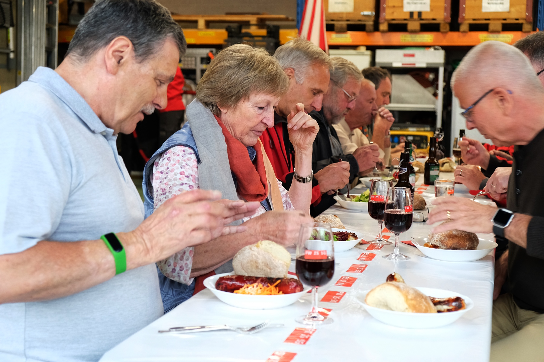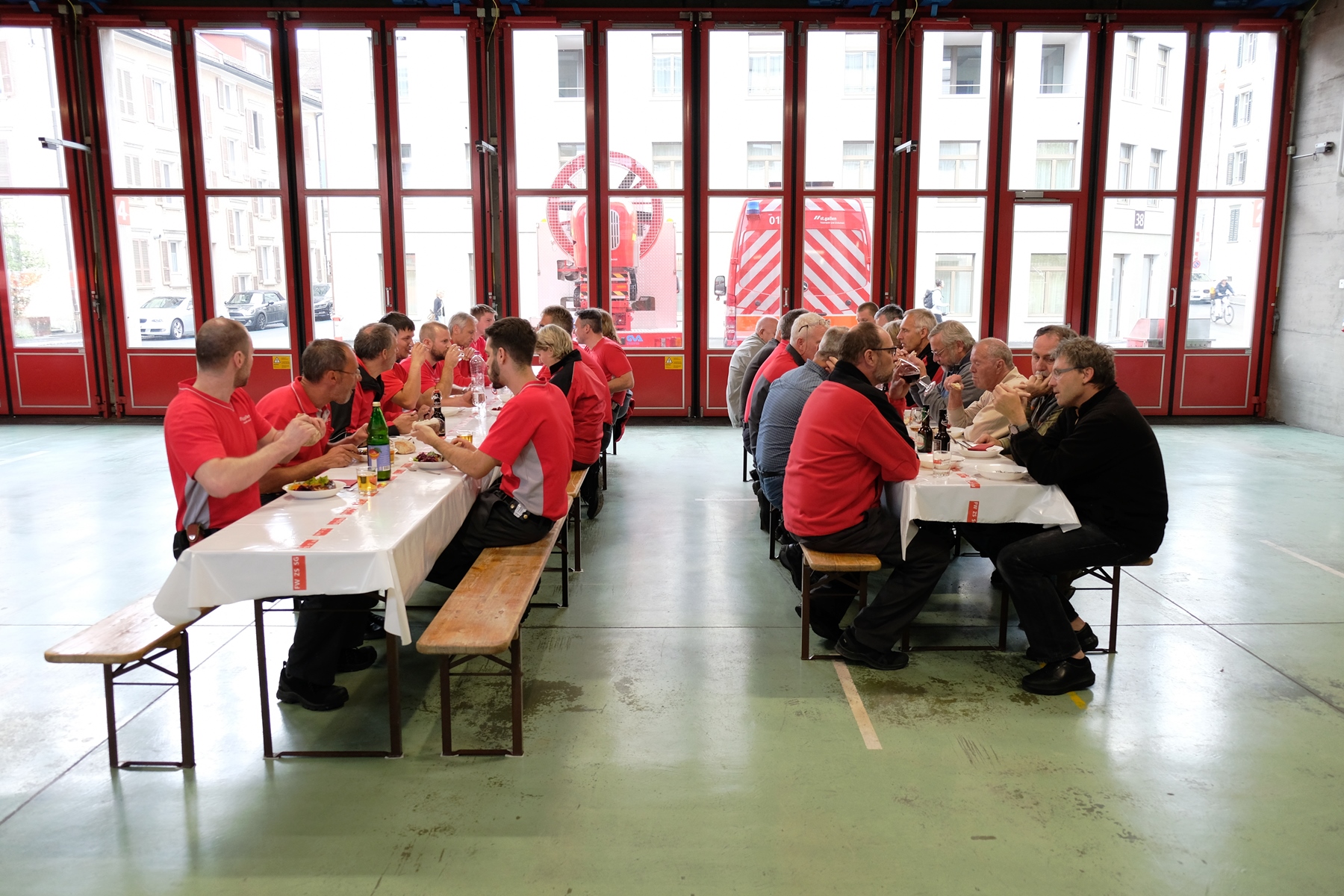 Am Mittwoch, 16. Mai fand das alljährliche Pensioniertentreffen von Feuerwehr und Zivilschutz St.Gallen statt. Trotz regnerischem Wetter fanden sich neun ehemalige Mitarbeitende an der Notkerstrasse ein. Als Nachmittagsprogramm organisierte die Berufsfeuerwehr eine kleine Leistungsschau für ihre ehemaligen Kollegen. Im Übungsgelände Hofen wurden dazu verschiedene Einsätze wie Auto- und Garagenbrände demonstriert. Zudem konnten die Gäste den neuen Geländestapler von FWZSSG begutachten und im Korb der Autodrehleiter die Aussicht über das Hofengelände geniessen. Als Abschluss des Tages fanden sich alle in der Fahrzeughalle der Berufsfeuerwehr ein, wo vom Dienstzug bereits ein gutes Nachtessen vorbereitet wurde. Bei Wurst, Salat und guten Gesprächen liessen die ehemaligen und aktuellen Mitarbeitenden von Feuerwehr und Zivilschutz den spannenden und gemütlichen Nachmittag ausklingen.