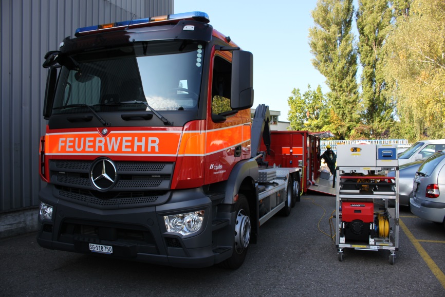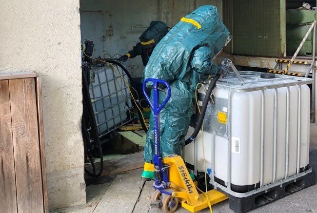 Dieses Jahr durften die Angehörigen der Berufsfeuerwehrbei der BWB-Altenrhein AG in Altenrhein trainieren. Übungsannahme war ein IBC Behälter, welcher eine Leckage vorwies. Beim Medium handelte es sich um Natronlauge, die teils im Behälter und teils im Keller des Gebäudes war. Der Chemiestützpunkt hatte die Aufgabe den lecken Behälter umzupumpen und das ausgelaufene Medium aufzunehmen. Diese Aufgabe muss in Vollschutzanzügen erledigt werden. Anschliessend mussten die Einsatzkräfte und das Material dekontaminiert und neutralisiert werden.