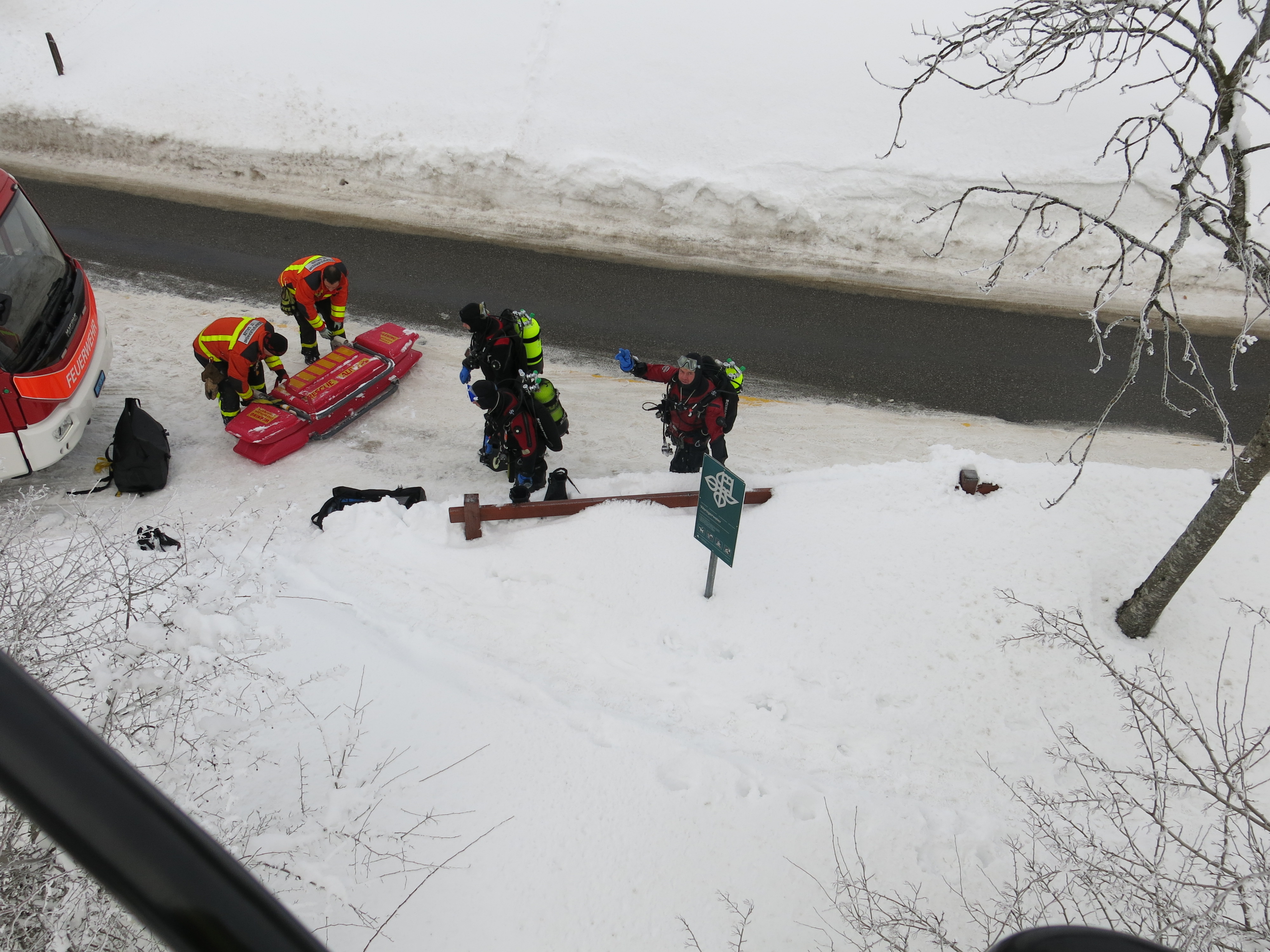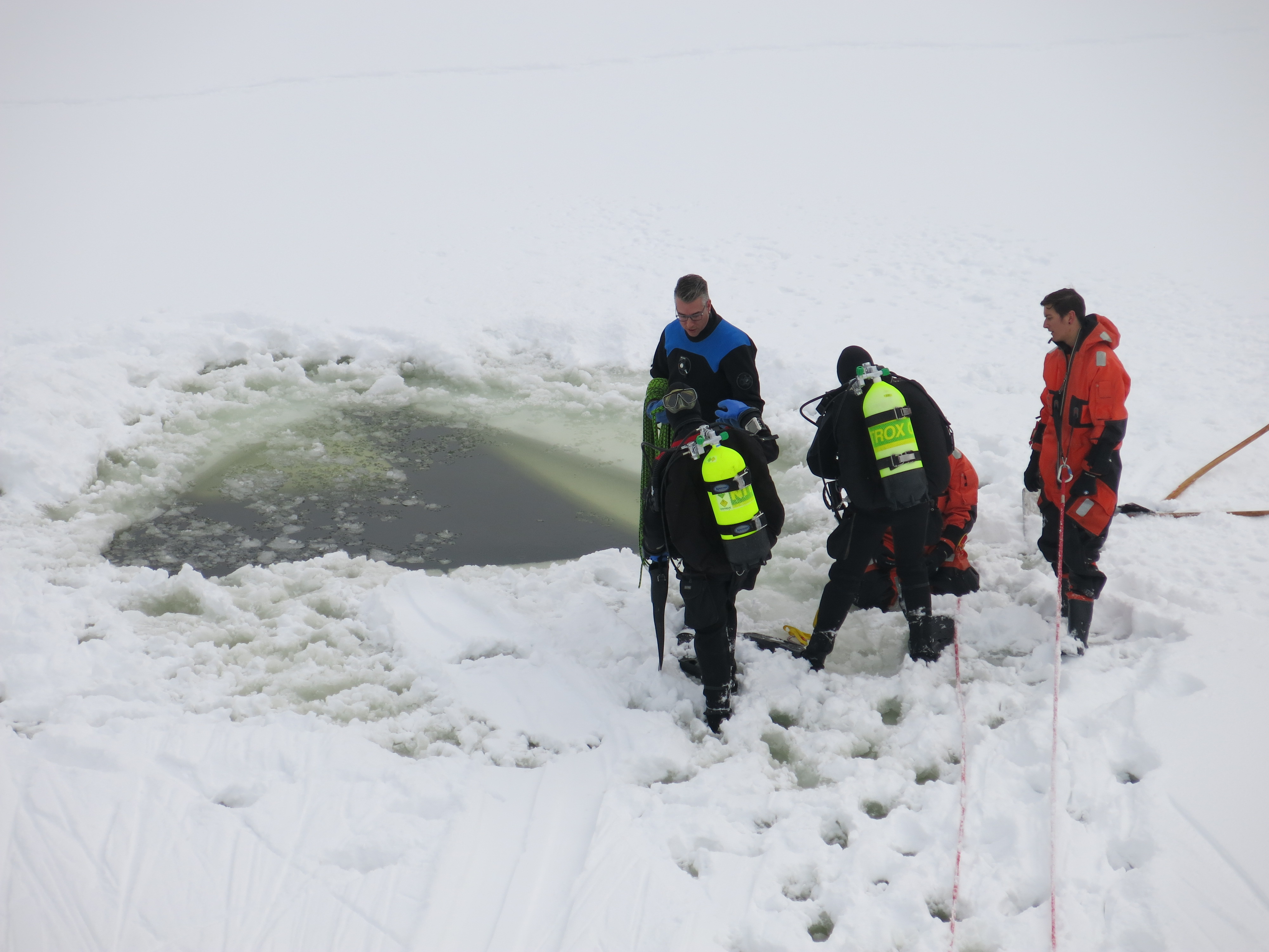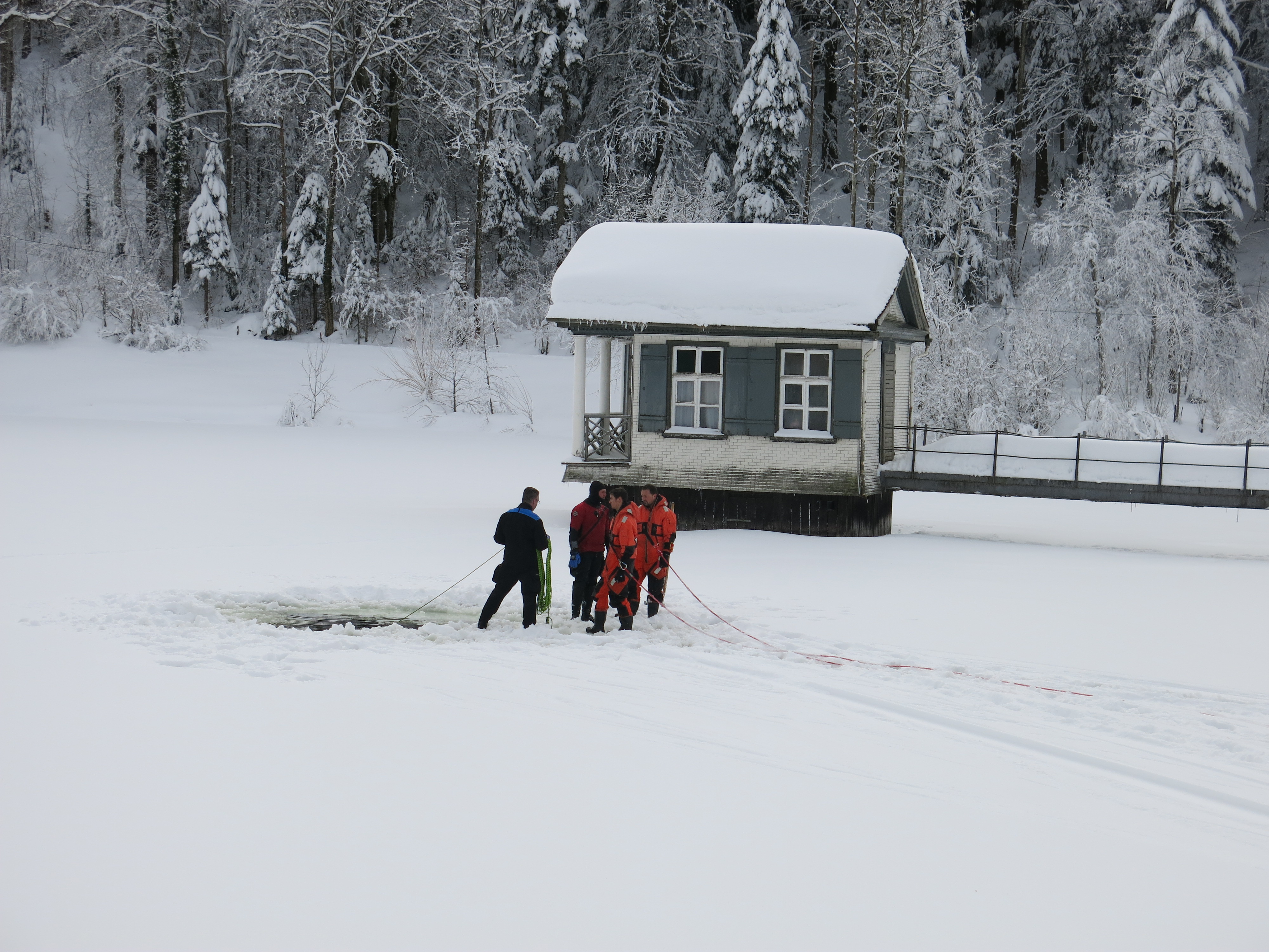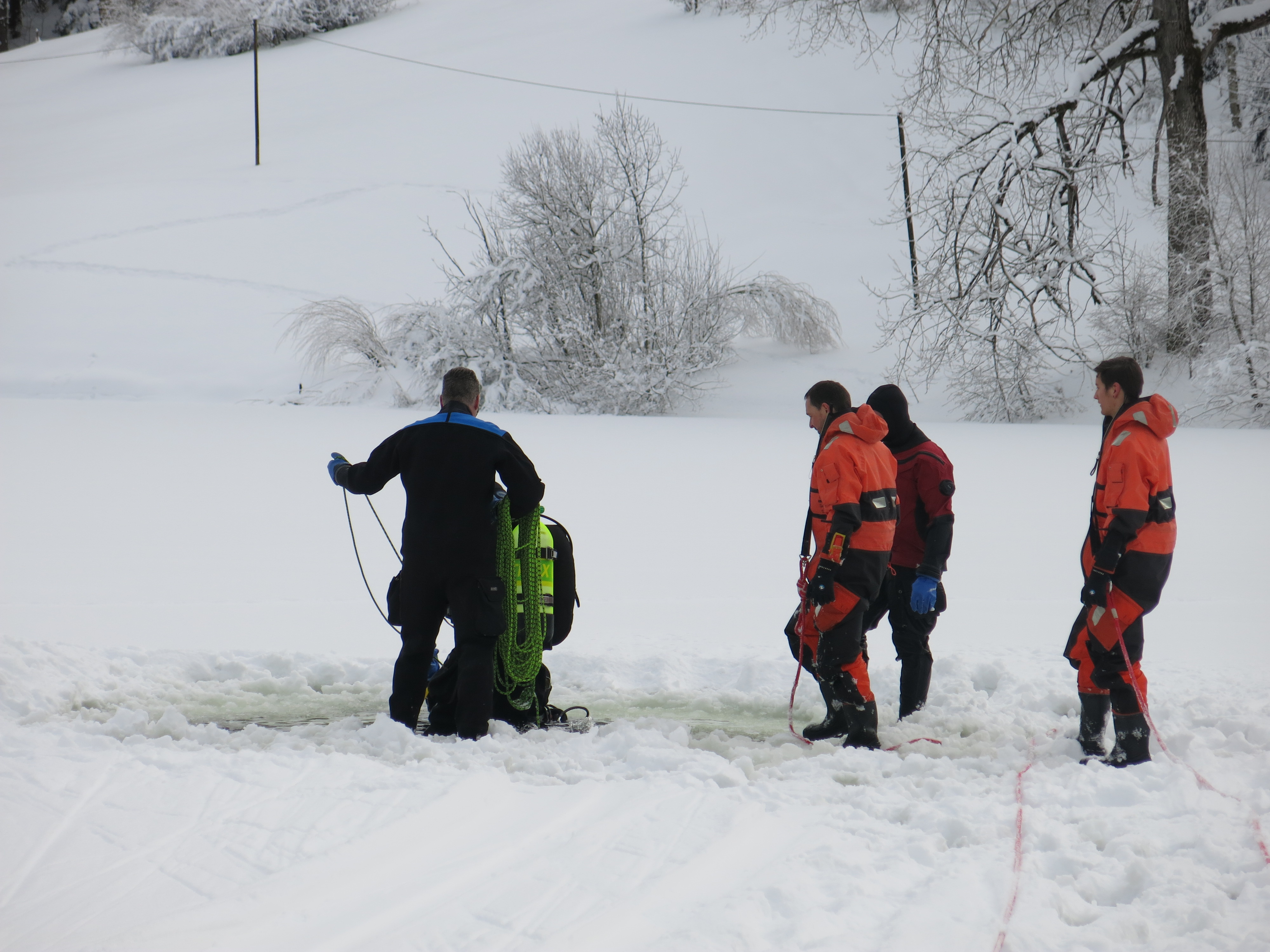 Eine Unachtsamkeit genügt und Menschen oder Tiere können ins Eis einbrechen. Diese Situation ist sehr gefährlich und eine Befreiung aus eigener Kraft fast nicht möglich. Jede Minute zählt, denn die Unterkühlung kommt schnell. Damit einer eingebrochenen Person oder einem Tier schnell geholfen werden kann, übt die Feuerwehr St.Gallen regelmässig eine schnelle Rettung. Unterstützt werden die Einsatzkräfte von FWZSSG durch die Taucher der Stadtpolizei.