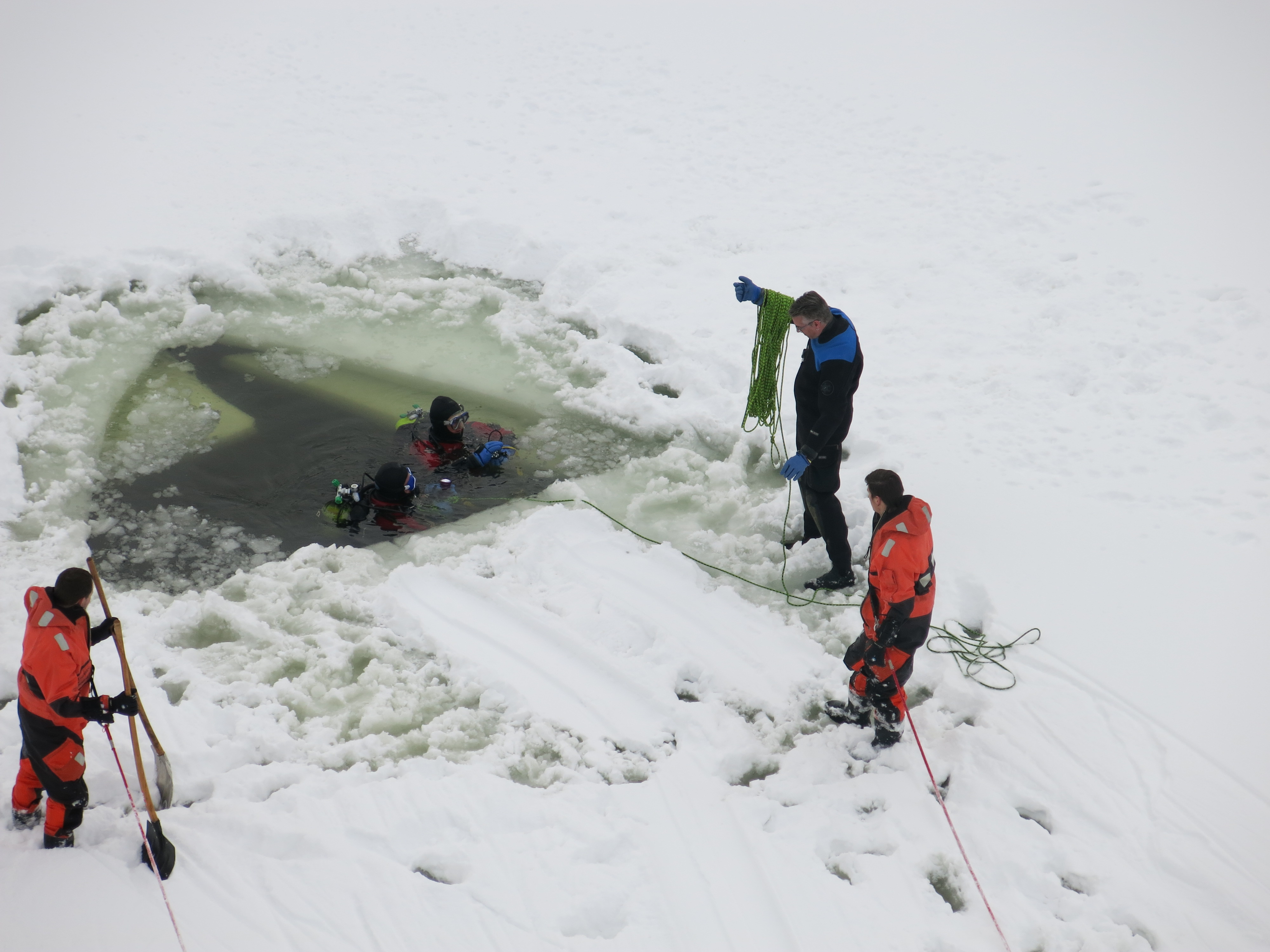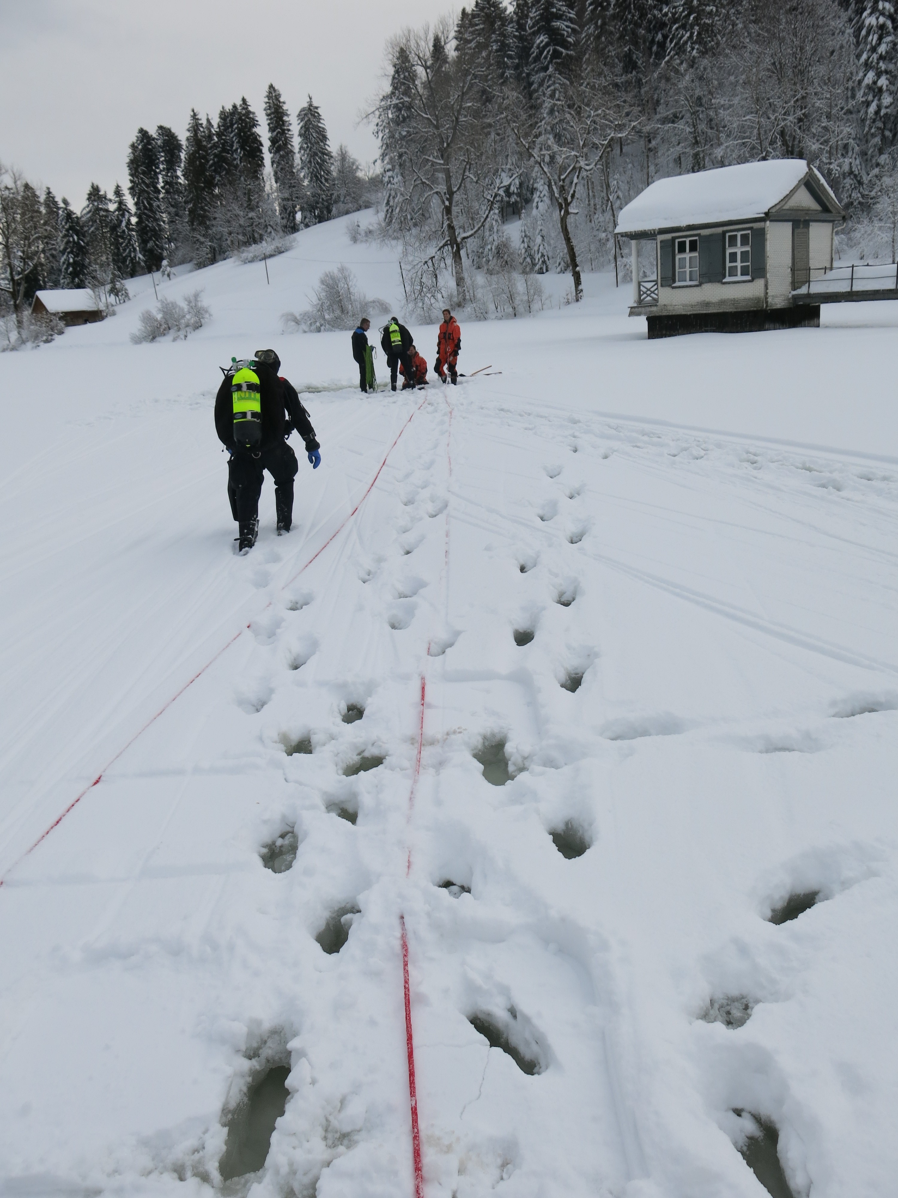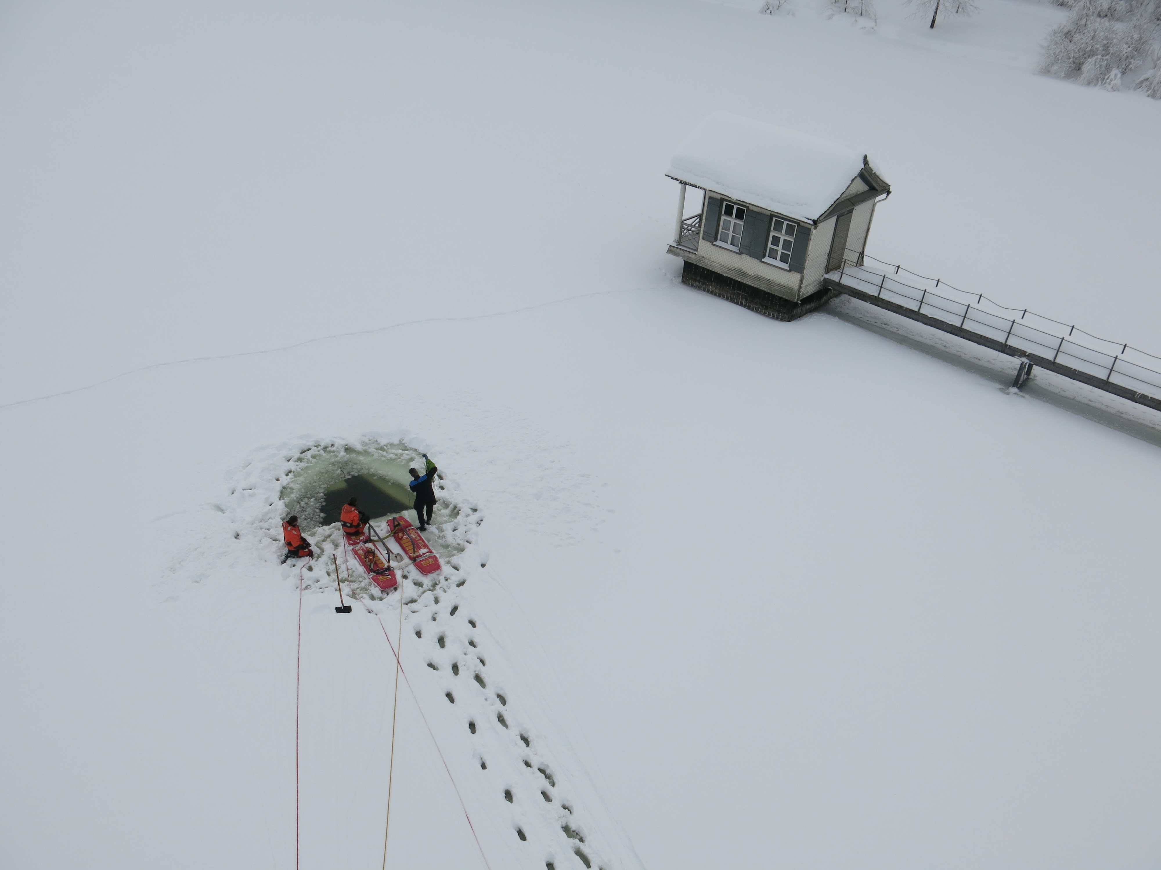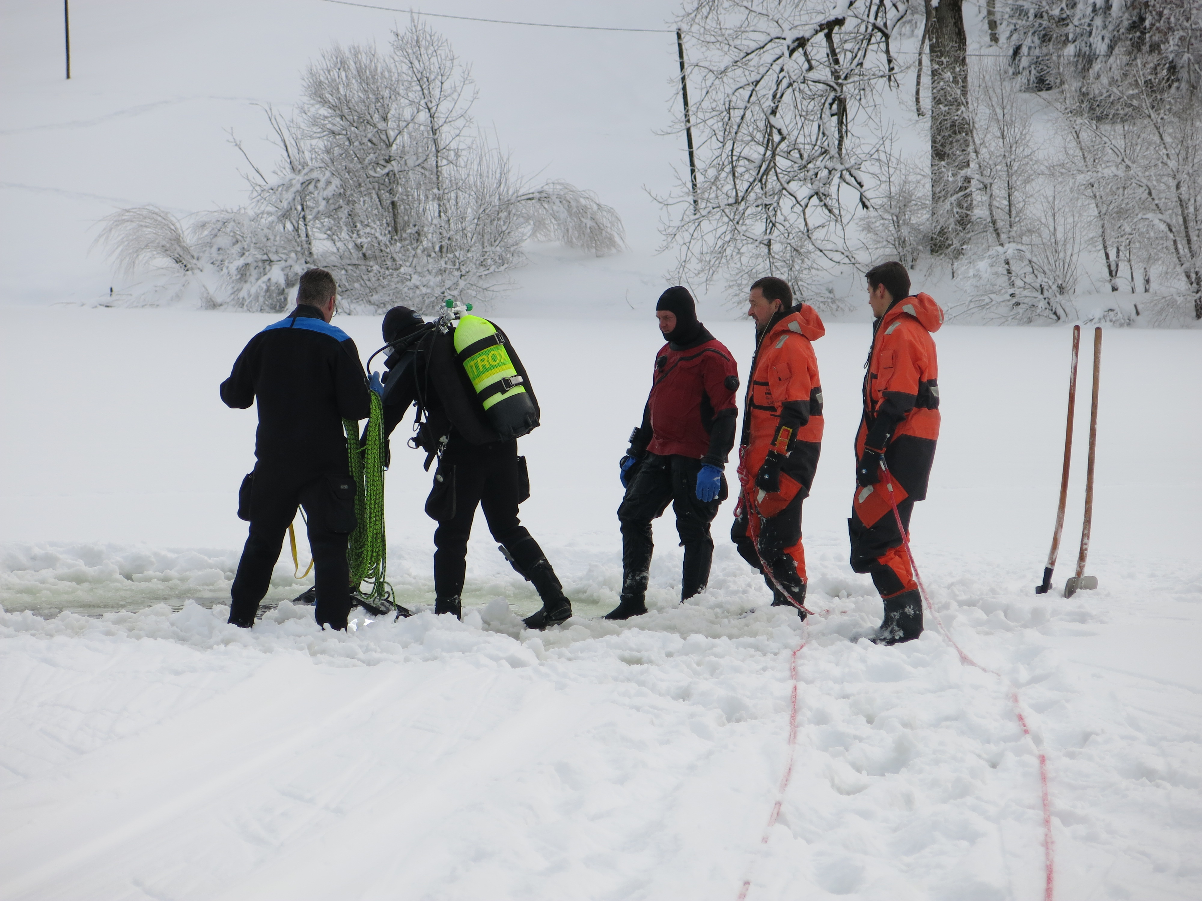 Eine Unachtsamkeit genügt und Menschen oder Tiere können ins Eis einbrechen. Diese Situation ist sehr gefährlich und eine Befreiung aus eigener Kraft fast nicht möglich. Jede Minute zählt, denn die Unterkühlung kommt schnell. Damit einer eingebrochenen Person oder einem Tier schnell geholfen werden kann, übt die Feuerwehr St.Gallen regelmässig eine schnelle Rettung. Unterstützt werden die Einsatzkräfte von FWZSSG durch die Taucher der Stadtpolizei.