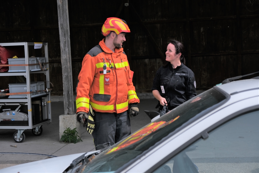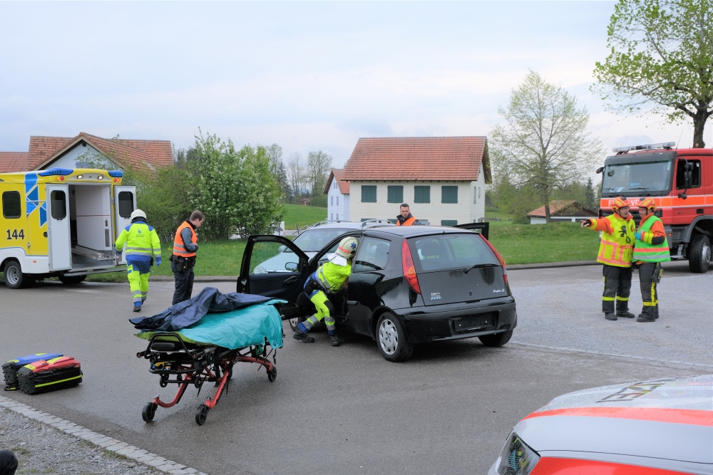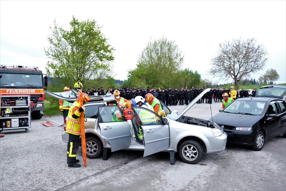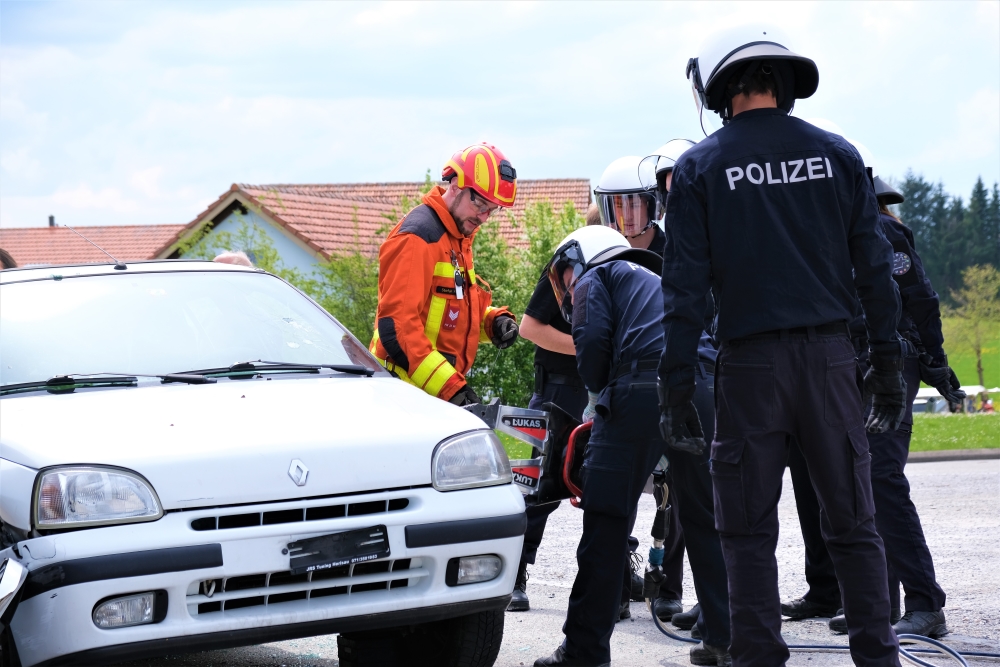 Der Höhepunkt des Tages bildete die Übung «Finale», bei welcher ein Autounfall inszeniert wurde. Mit diesem Einsatz konnte den Aspirantinnen und Aspiranten demonstriert werden, wie die Partnerorganisationen des Bevölkerungsschutzes im Verbund einen Einsatz meistern – von der Strassensicherung bis zum Abtransport der verletzten Personen.