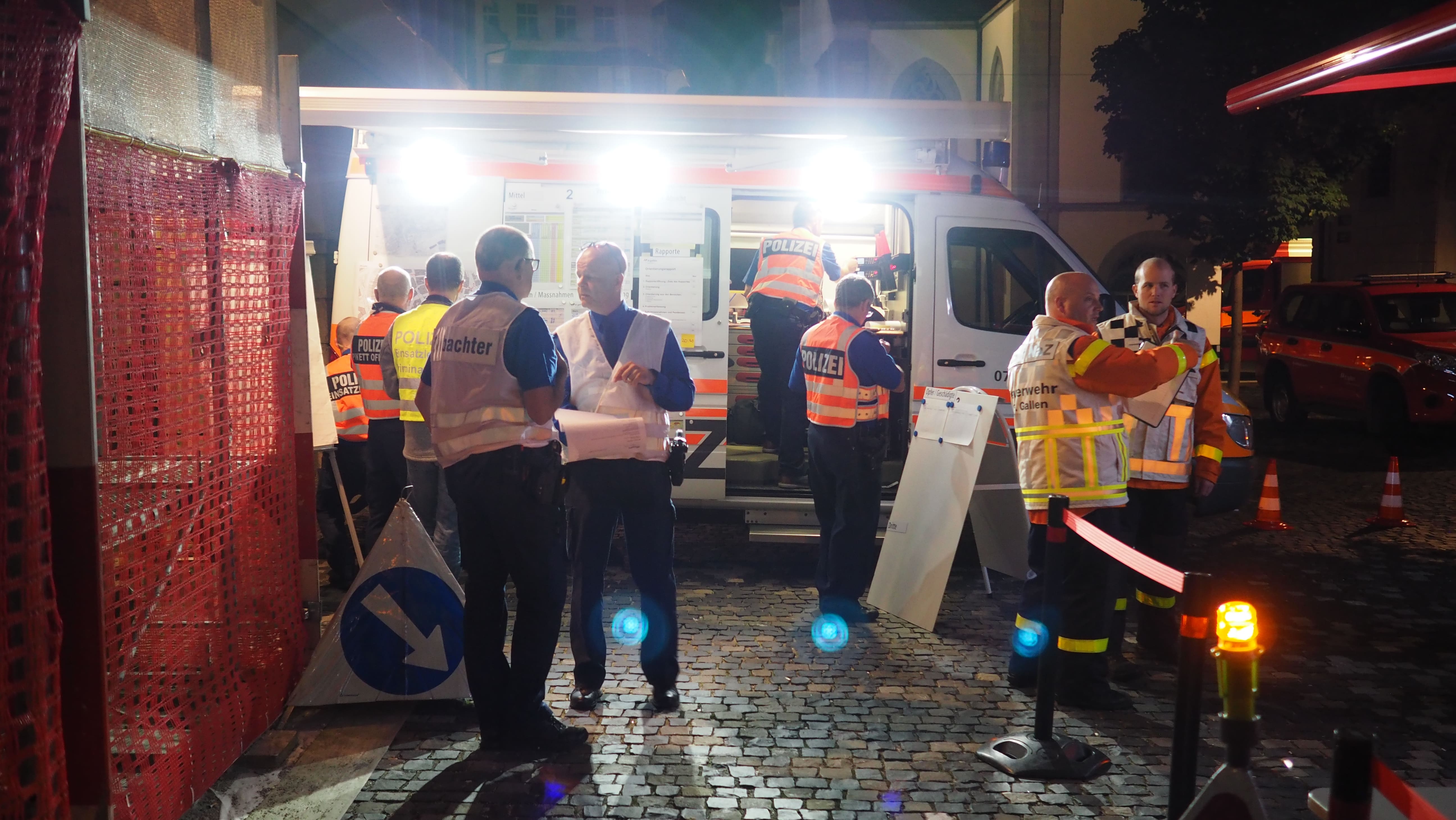 Bei einem Grossereignis wie diesem, wird automatisch die Alarmstufe 2 ausgelöst. Dies hat zur Folge, dass sowohl die Berufs- als auch die Milizfeuerwehr der Stadt St. Gallen alarmiert wird. Des Weiteren wird die Polizei als hauptverantwortliche Blaulichtorganisation und die Sanität aufgeboten. Die verschiedenen Organisationen beziehen mit ihren Einsatzmitteln vorab definierte Arbeitsplätze. Ziel dieser ereignisausgerichteten Standardisierung ist es, den Faktor Zeit und als Folge davon, den potentiellen Schaden möglichst gering zu halten.