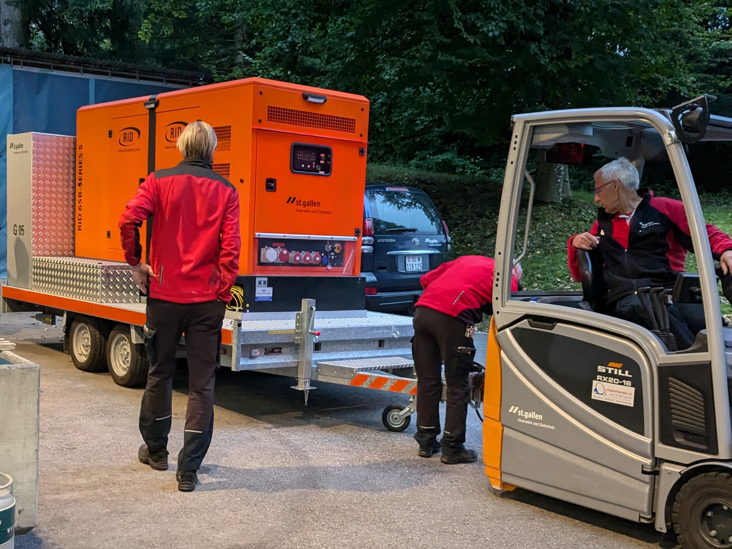 Regelmässig werden Tests durchgeführt, ob die Geräte noch funktionieren und das auch auf längere Zeit. Heute wurde der mobile Notstromgenerator der Logistik getestet. Mit einer direkten Einspeisung am Gebäude liefert der Generator Strom für das Licht, die Apparate oder die Technik, aber auch um E-Autos aufzuladen.