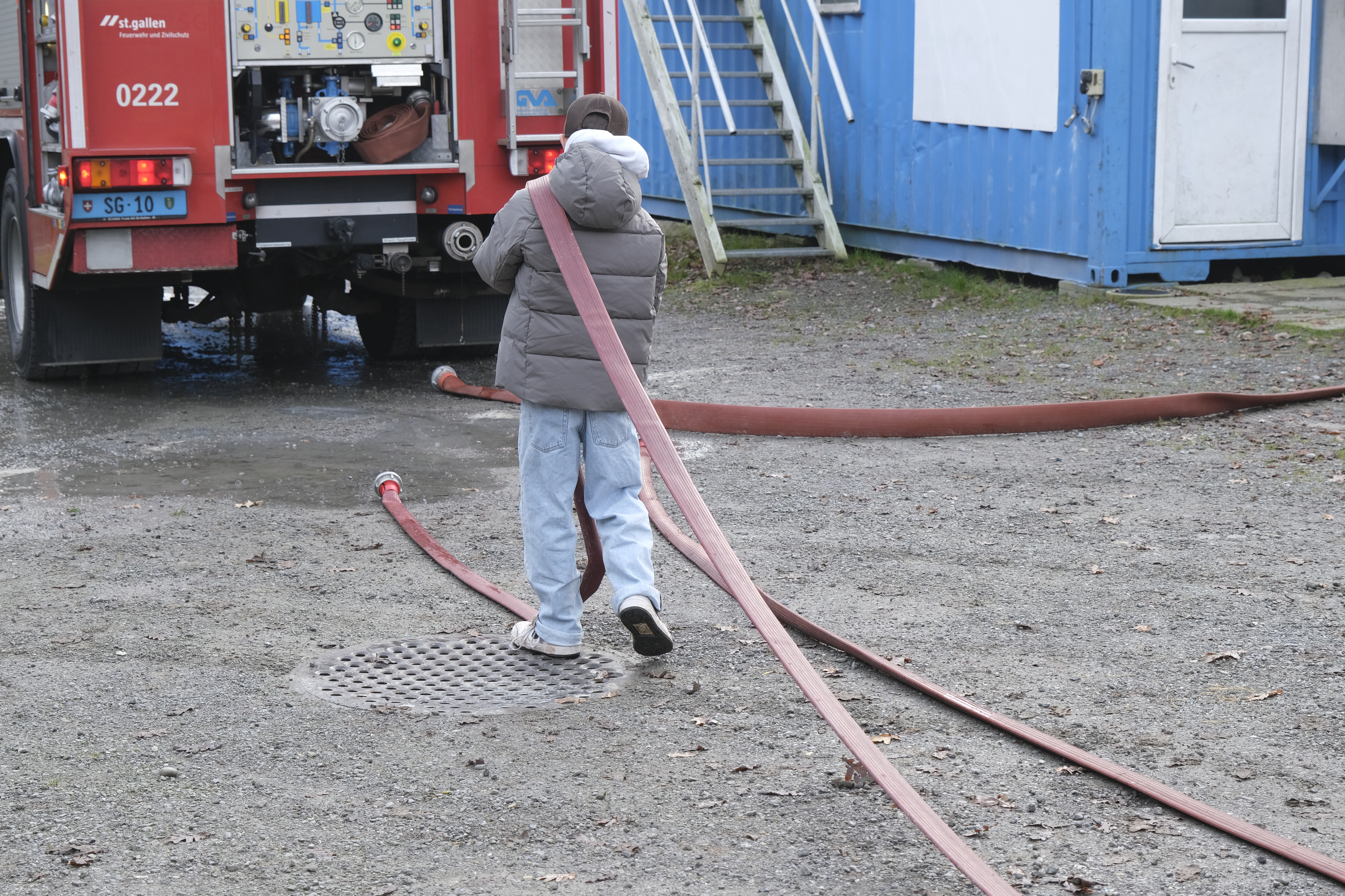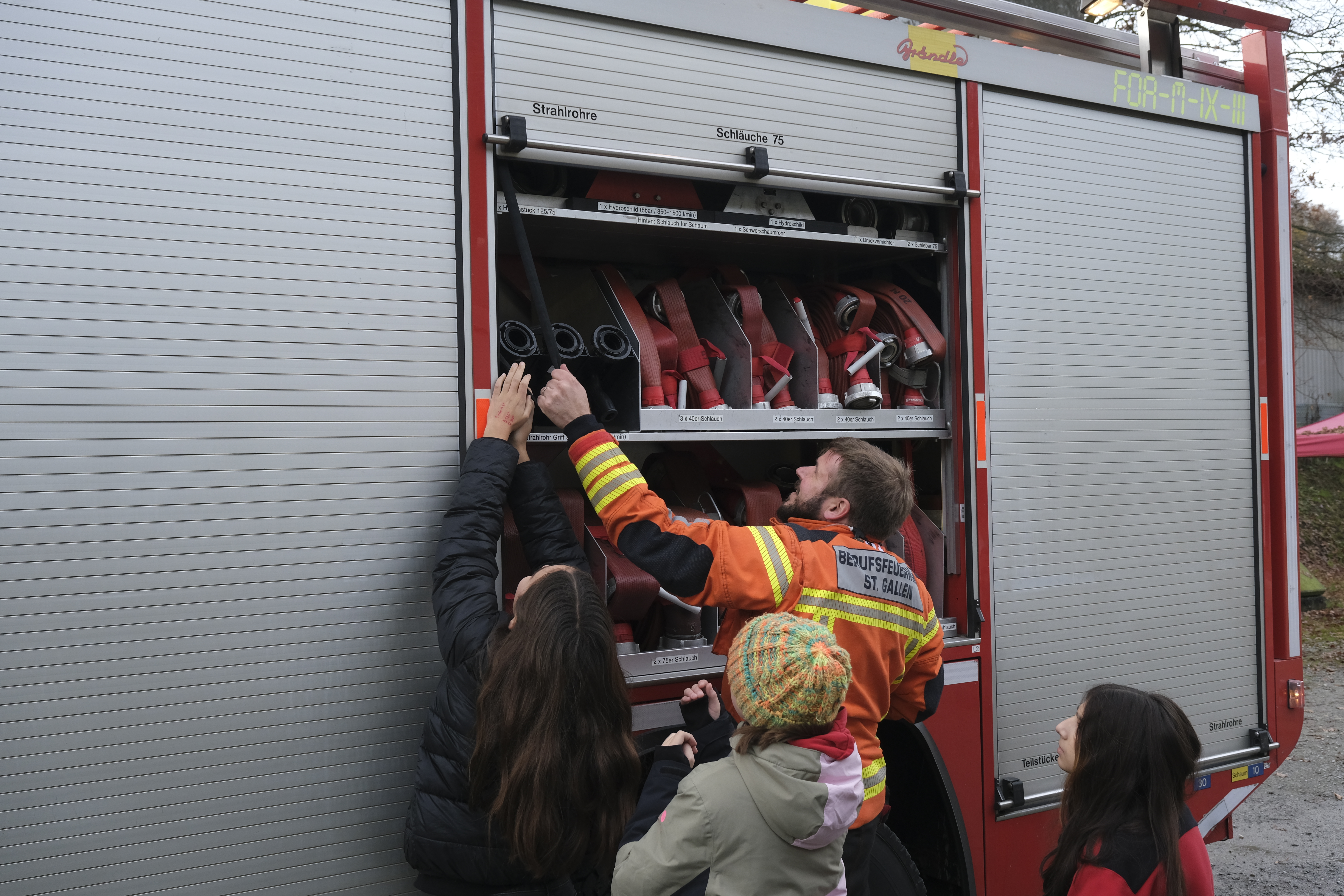 Ein erlebnisreicher Vormittag mit spannenden Einblicken: Draussen wurden die Elemente Feuer & Wasser entdeckt und im Gebäude ging es von der Fahrzeughalle bis hin zu einem Ausblick in luftiger Höhe.