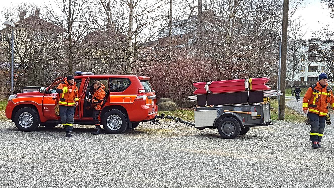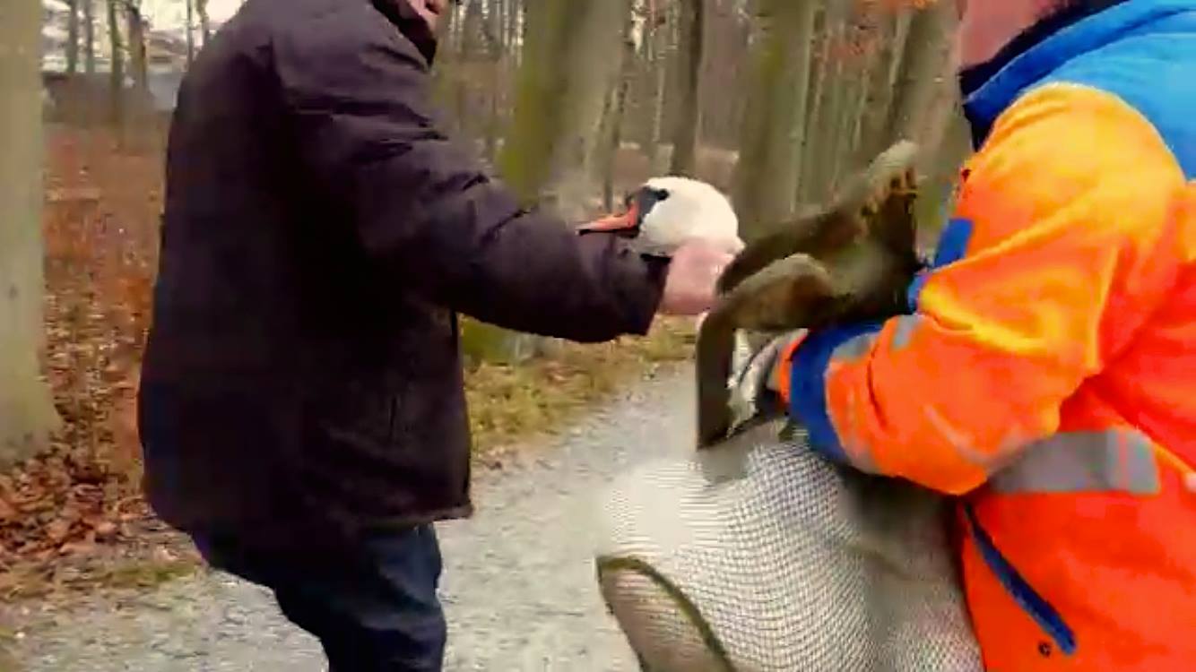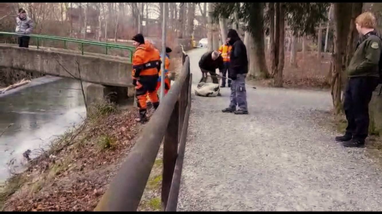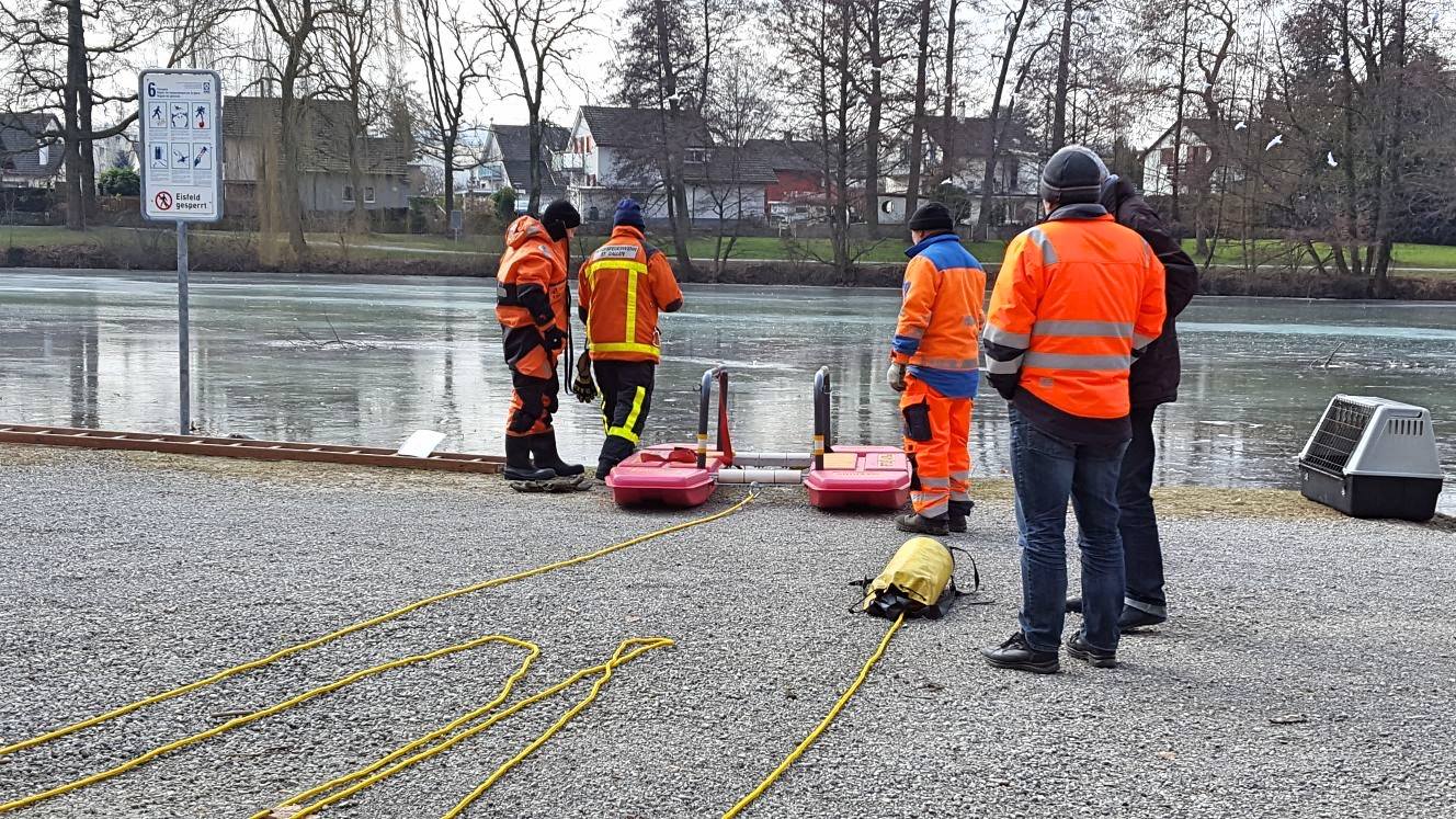 In Arbon ist ein Schwan auf einem Weiher festgefroren. Die Berufsfeuerwehr St.Gallen rückte mit dem Eisrettungs-Equipment aus.