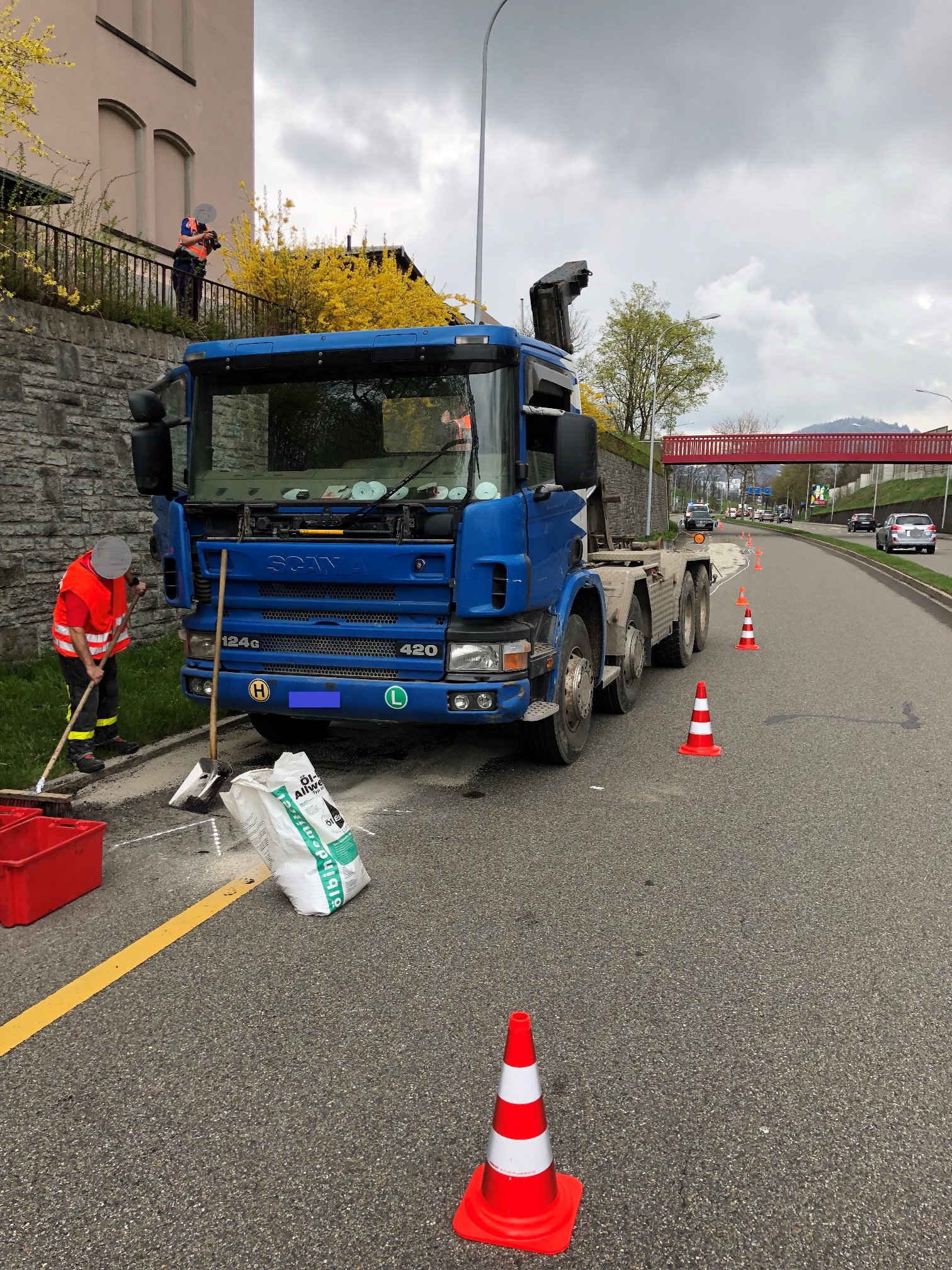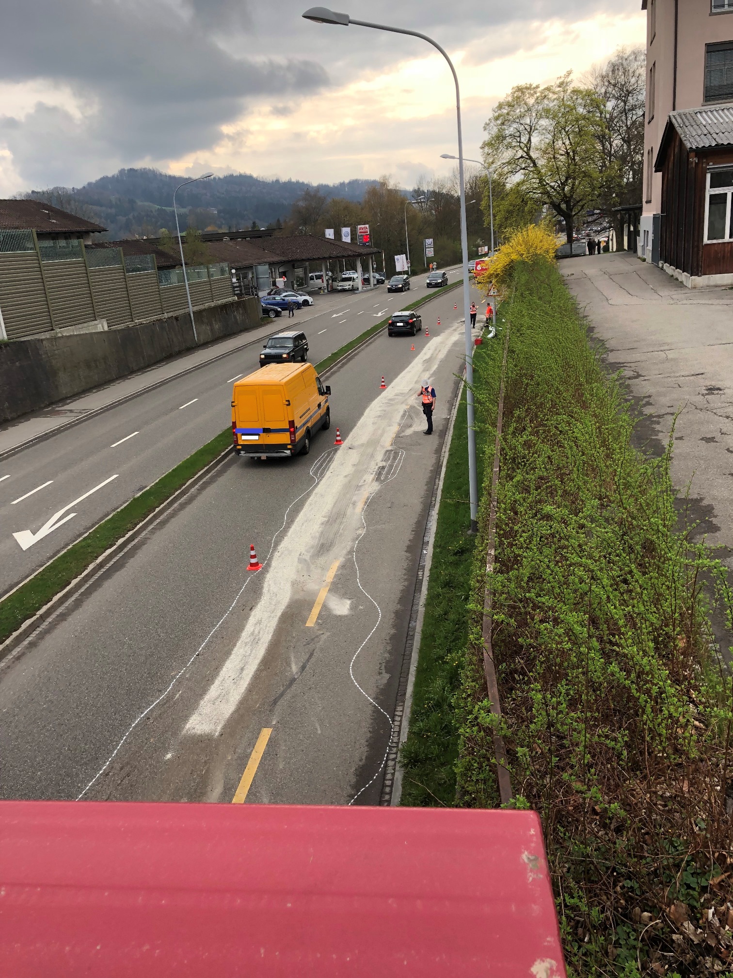 Wechsellader-Fahrzeug hat mit Haken an der Fussgängerbrücke eingehängt. Da Motoren- und Getriebeoel auf 100 Metern ausflossen, wurden diese mittels Oelbinder aufgenommen und anschliessend fachgerecht entsorgt.