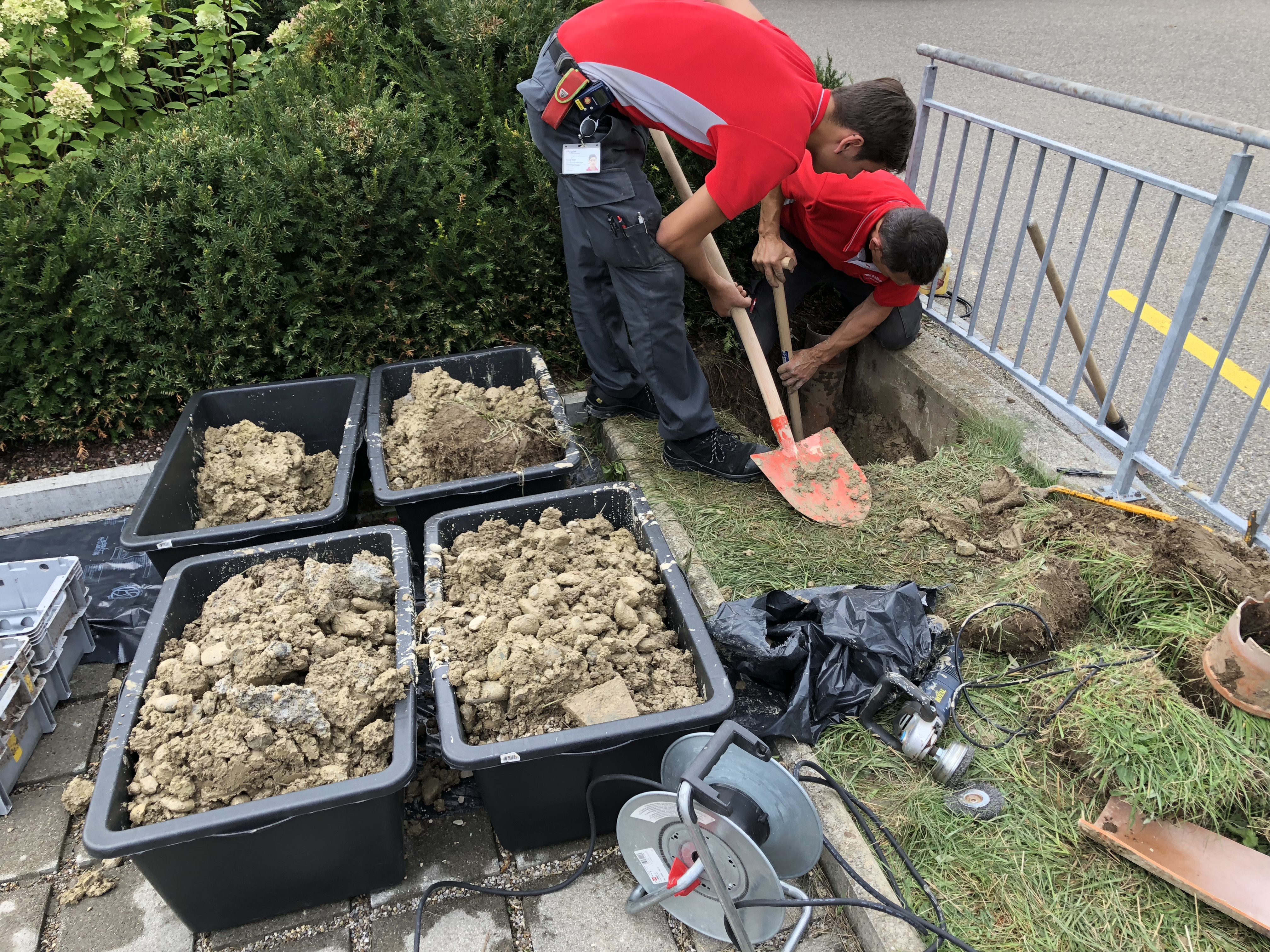Mit einer Endoskop-Kamera wurde der Standort der Katzen ermittelt. Anschliessend wurde der Boden aufgegraben und das Rohr abgeschnitten. Da der Grundwasserspiegel im erstellten Graben anstieg, musste dieser mit einer Tauchpumpe ausgepumpt werden. Zusätzlich wurde mit Holz eine Katzenleiter gebaut, damit die Katzen selber aus dem Graben klettern konnten. Dank all diesen Massnahmen konnten die Katzen befreit werden.