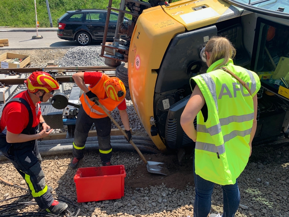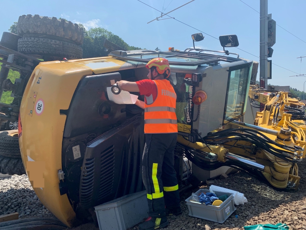 Am Mittwochnachmittag (24.07.2019) kam es bei Gleisarbeiten an der Speicherstrasse zu einem Unfall. Ein Schienenbagger ist aus noch unbekannten Gründen vom Gleis gekippt. Verletzt wurde glücklicherweise niemand. Allerdings tropfte Diesel aus dem Tankstutzen des Baggers.