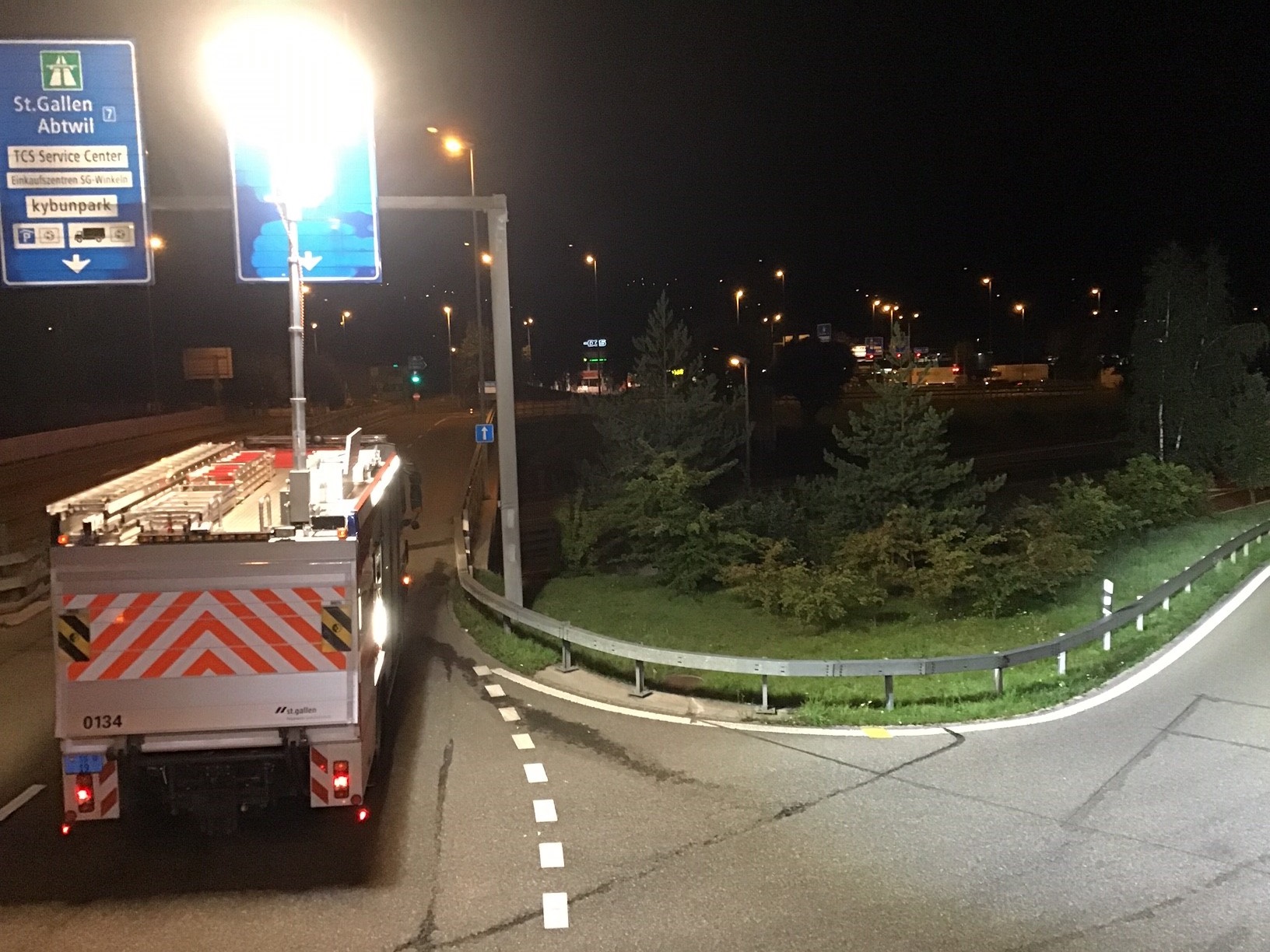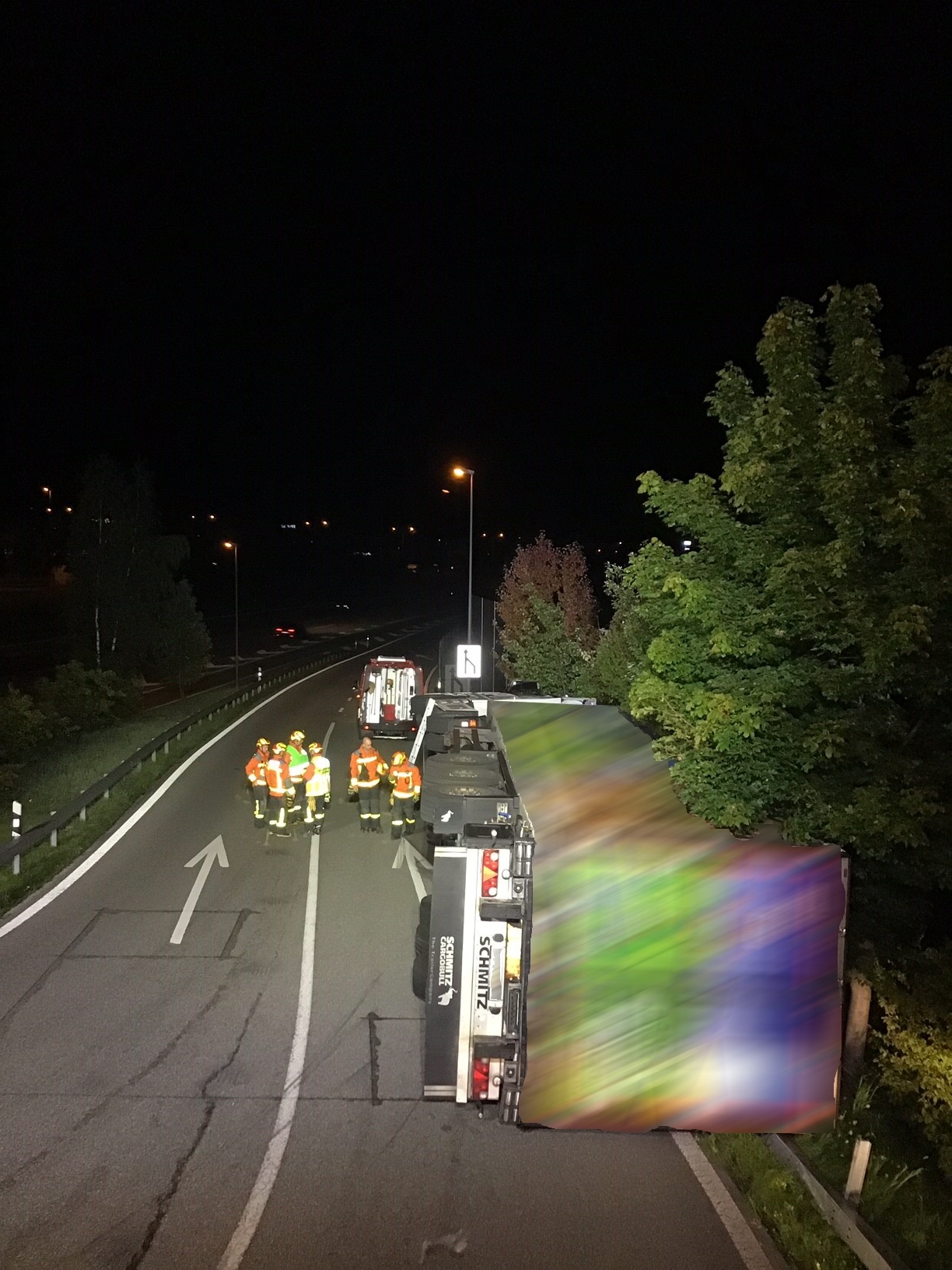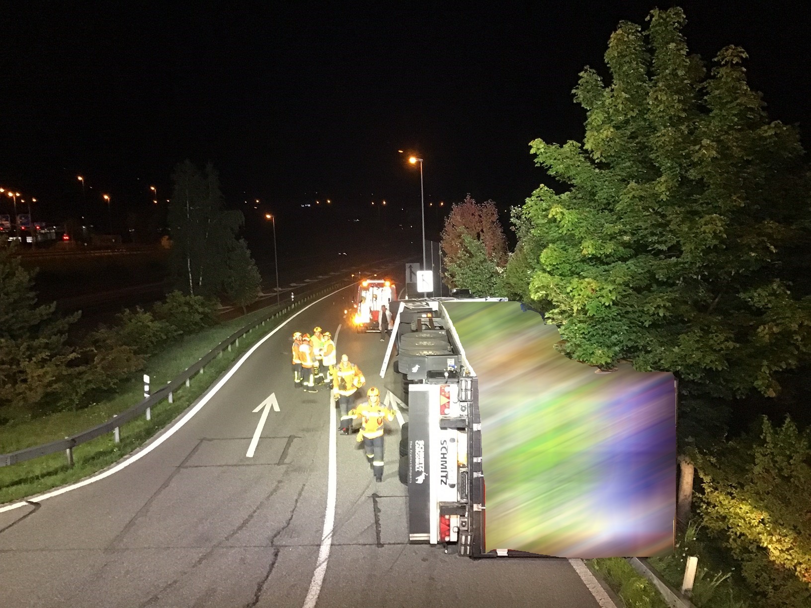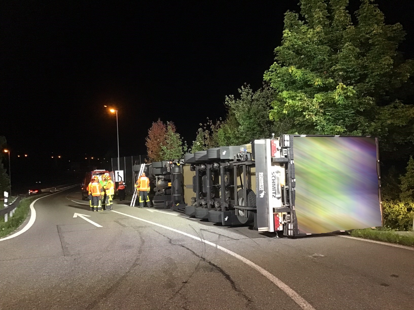 Am frühen Mittwochmorgen (04.09.2019) kippte auf der Autobahneinfahrt Winkeln, auf Höhe der Einfahrt des Kybun Parks in Richtung Zürich, ein mit hängendem Fleisch beladener Sattelschlepper um. Beim Eintreffen der Feuerwehr befand sich der 42-jährige Fahrer noch in der Führerkabine und wurde von der Feuerwehr umgehend befreit. Des Weiteren beleuchtete die Feuerwehr den Schadenplatz und unterstützte das Spezialunternehmen bei der Bergung des Fahrzeugs. Eine Kontanimation der Umwelt durch das beim Unfall ausgelaufene Öl wurde mittels Bindemittel und einem Ölbindetuch verhindert.
