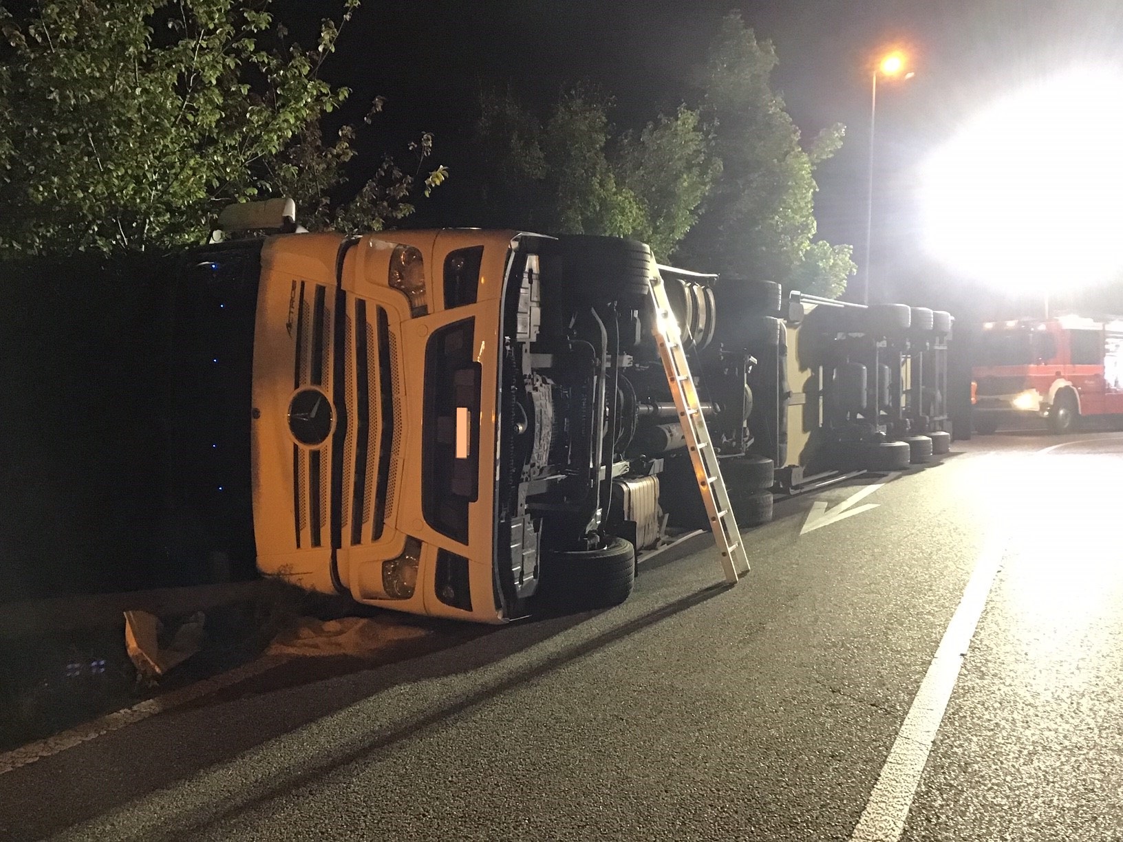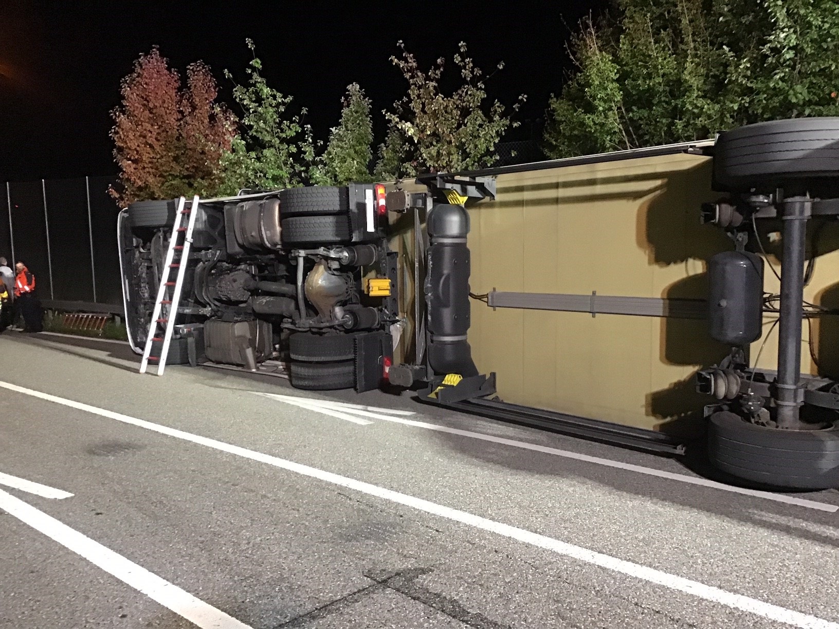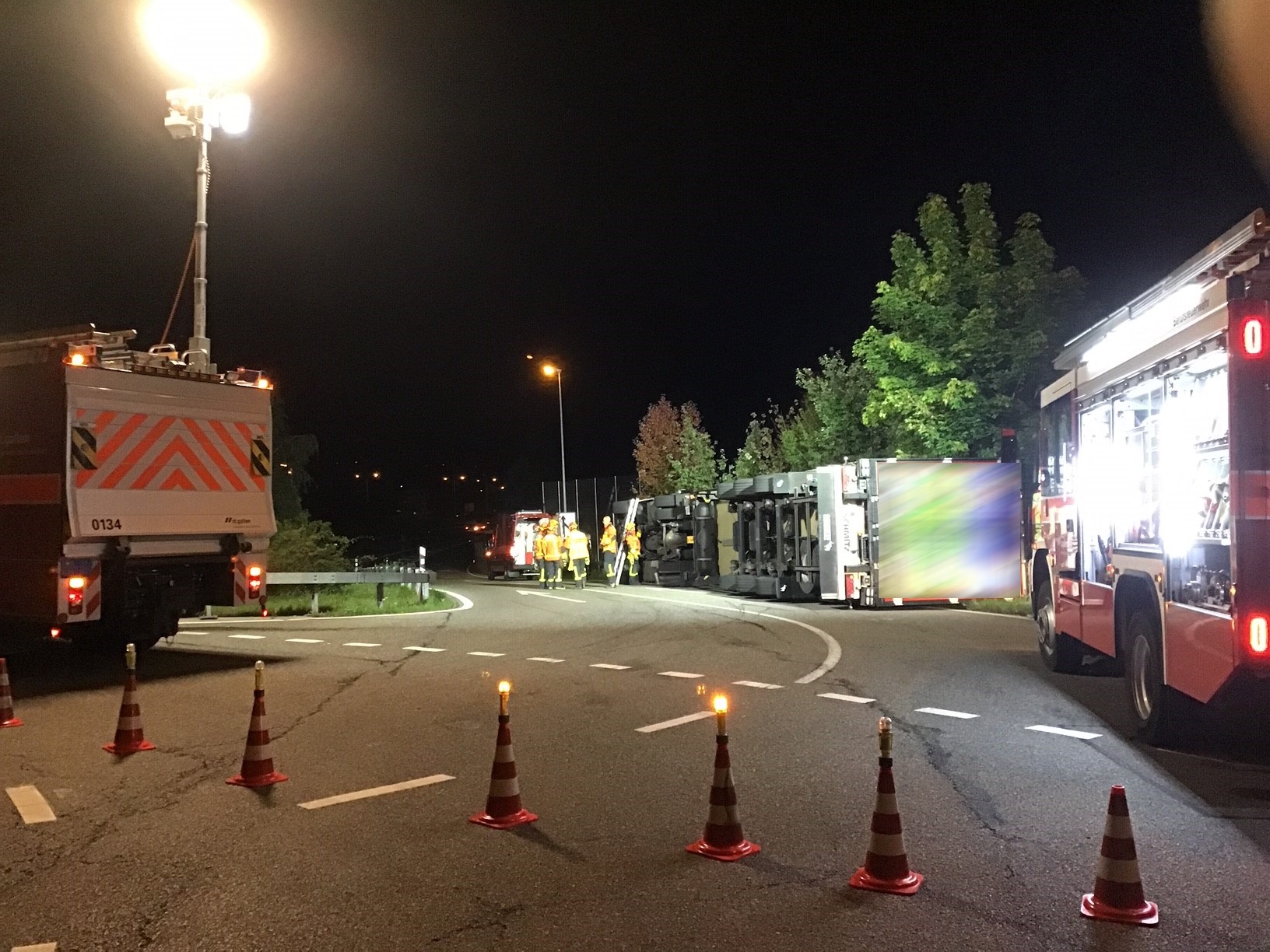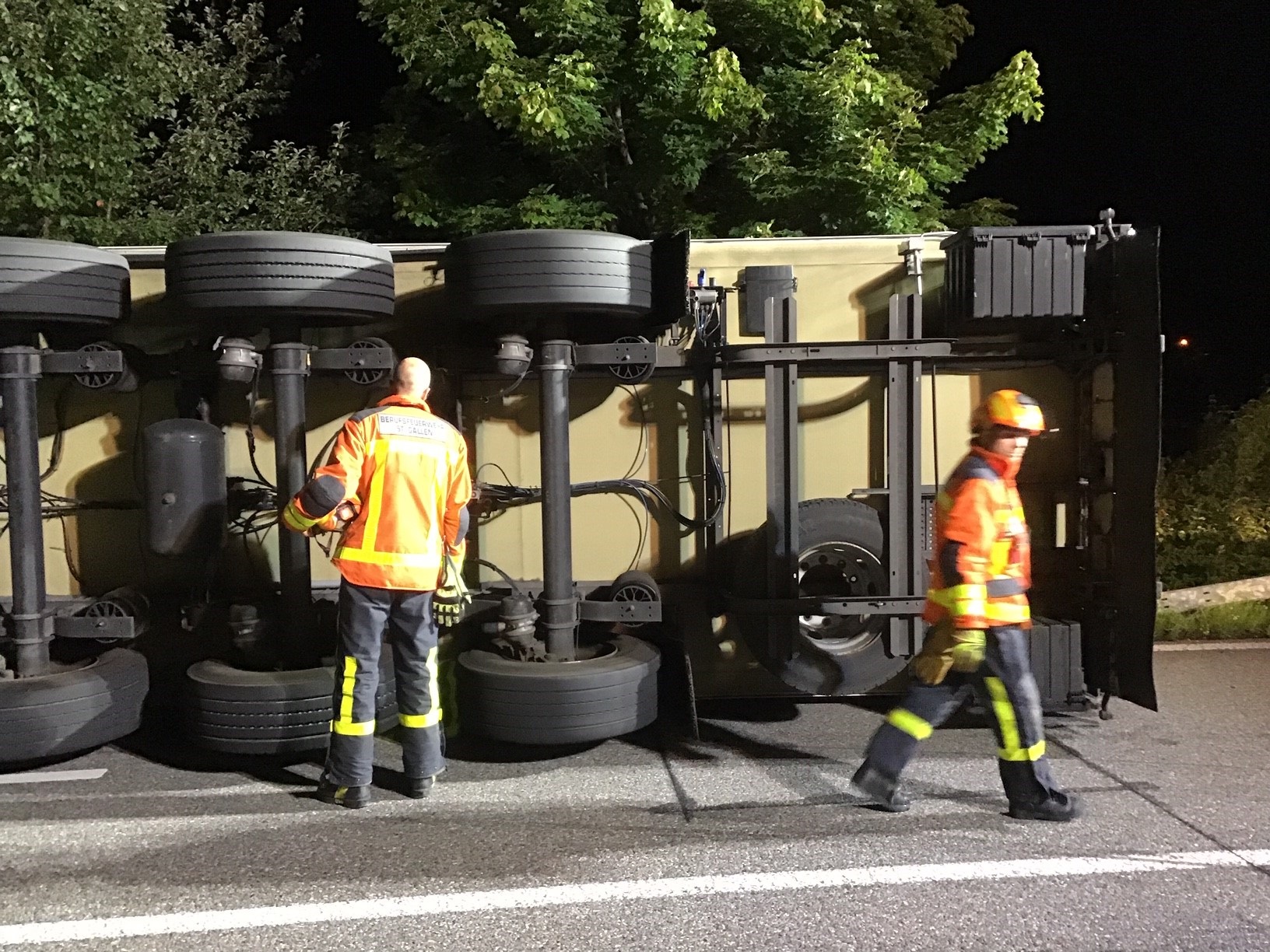 Am frühen Mittwochmorgen (04.09.2019) kippte auf der Autobahneinfahrt Winkeln, auf Höhe der Einfahrt des Kybun Parks in Richtung Zürich, ein mit hängendem Fleisch beladener Sattelschlepper um. Beim Eintreffen der Feuerwehr befand sich der 42-jährige Fahrer noch in der Führerkabine und wurde von der Feuerwehr umgehend befreit. Des Weiteren beleuchtete die Feuerwehr den Schadenplatz und unterstützte das Spezialunternehmen bei der Bergung des Fahrzeugs. Eine Kontanimation der Umwelt durch das beim Unfall ausgelaufene Öl wurde mittels Bindemittel und einem Ölbindetuch verhindert.