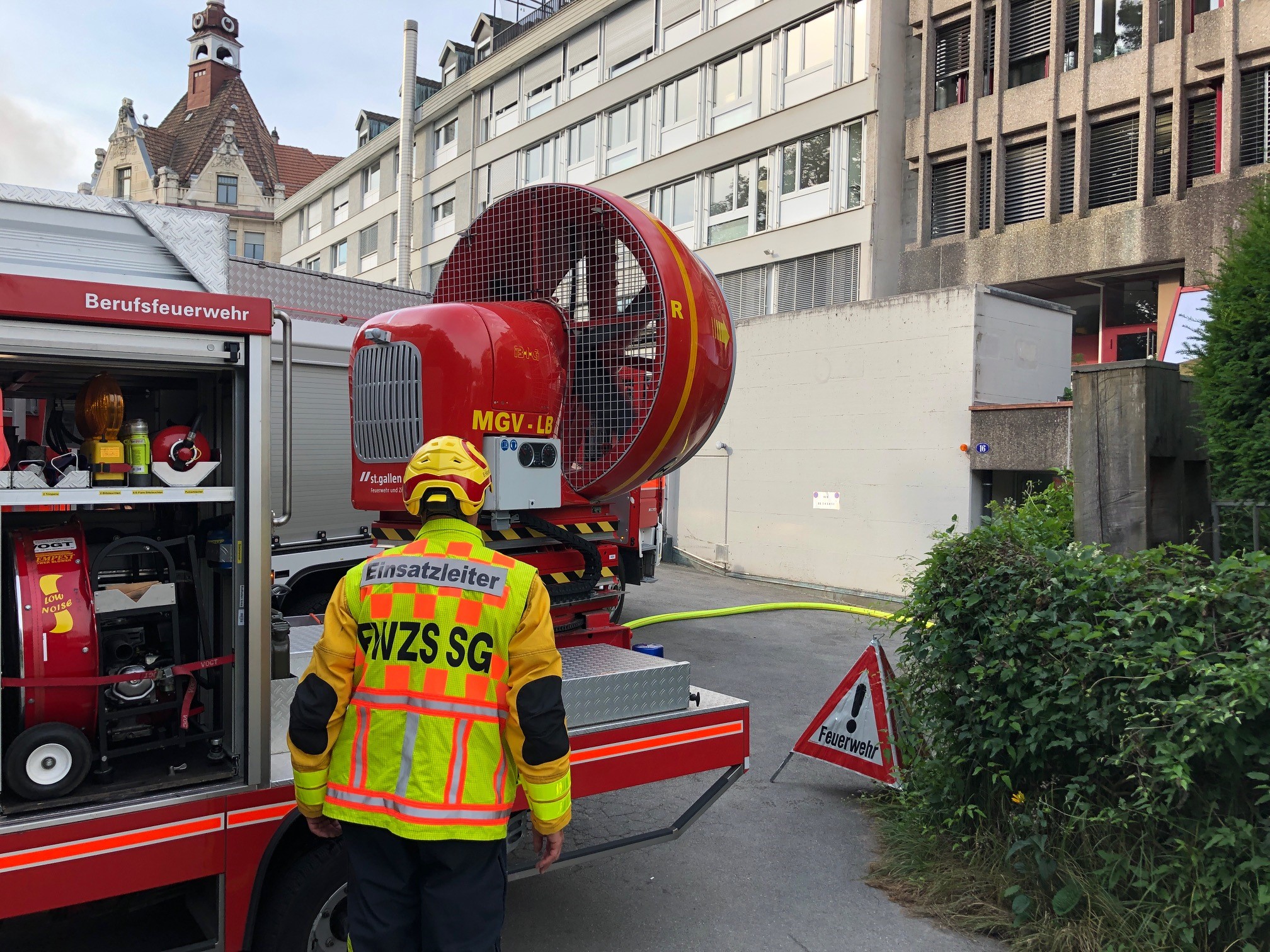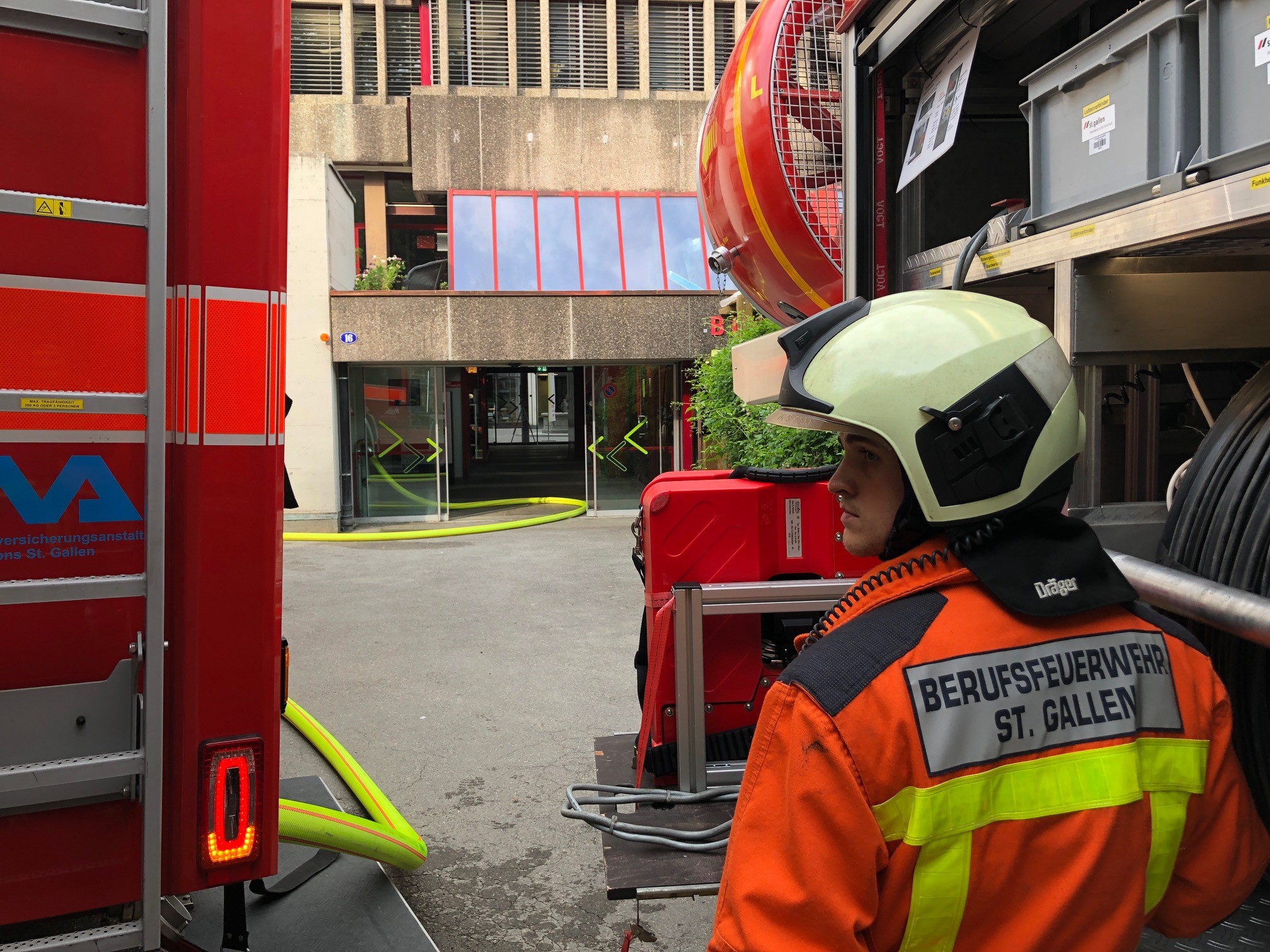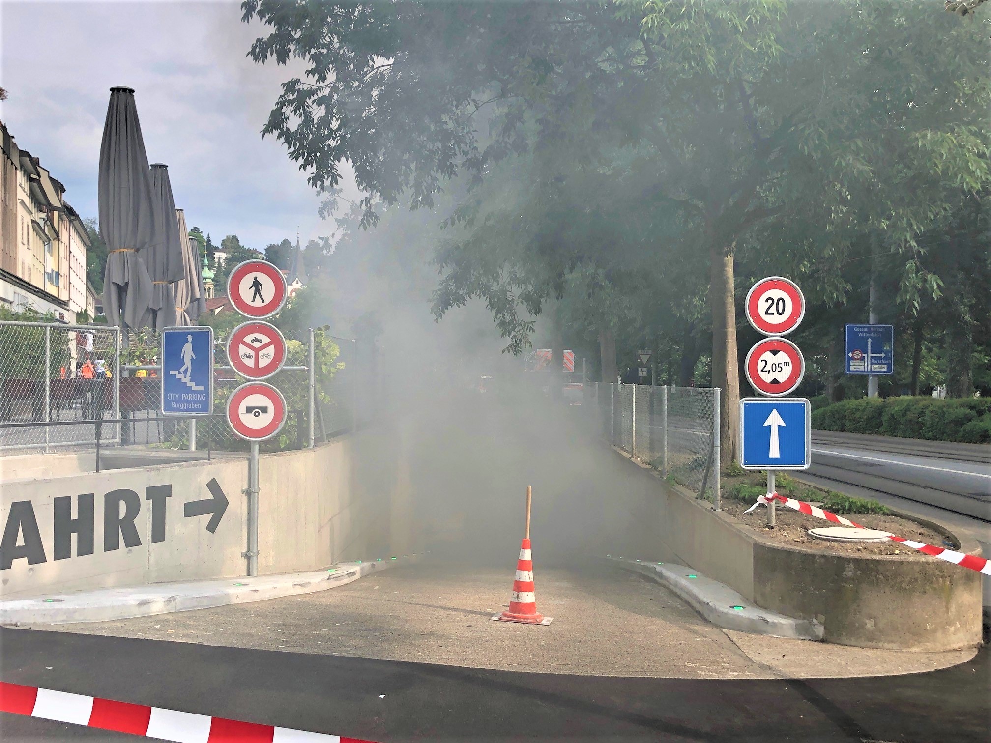 Am Mittwochmorgen (15.07.2020) wurde die Feuerwehr St.Gallen zu einem Fahrzeugbrand im Parkhaus Burggraben gerufen. Im 1. Untergeschoss fing ein bereits parkiertes Fahrzeug Feuer. Drei Angehörige der Berufsfeuerwehr drangen unverzüglich unter Atemschutz zum betroffenen Fahrzeug vor. Mit einer Druckleitung konnten sie den Brand rasch unter Kontrolle bringen. Durch den Brand und die Löscharbeiten entstand auf dem gesamten Parkdeck eine starke Rauchentwicklung. Durch den Einsatz des Mobilen Grossventilators (MGV) und mehreren Elektrolüftern konnte das Geschoss innerhalb kurzer Zeit entraucht werden. Zudem mussten einige angrenzende Geschäfte mit Lüftern vor dem Eindringen des Rauchs geschützt werden.