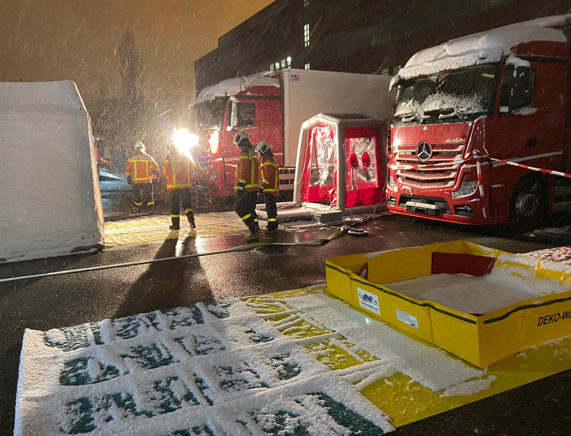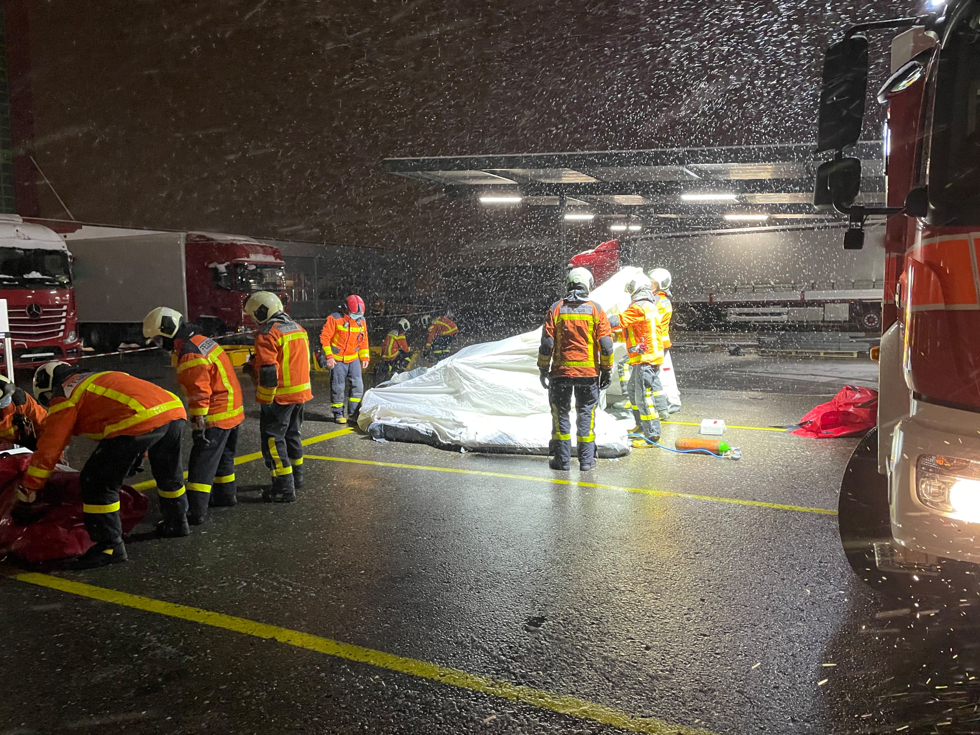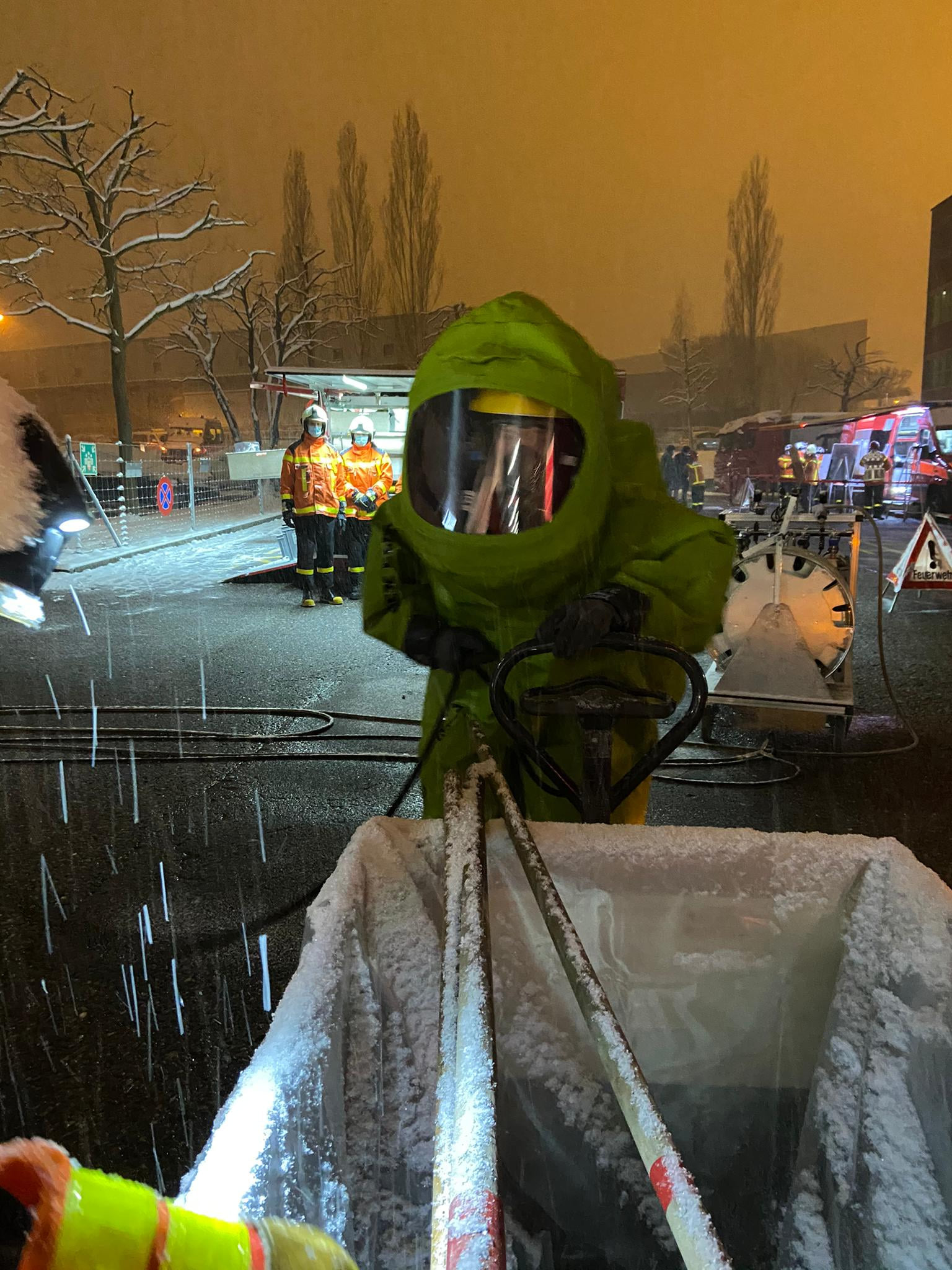 Am Freitagabend (19.03.2021) kam es im Westen der Stadt St.Gallen zu einem Chemieereignis. Bei Arbeiten wurde ein IBC-Behälter mit einer stark ätzenden Flüssigkeit beschädigt, woraufhin eine grössere Menge des Mittels auslief. Ein Grossteil der Flüssigkeit konnte vor Ort in eine Spaltanlage abgeleitet werden. Ungefähr 200 Liter gelangten jedoch auf den Boden des Industriegeländes. Um 21.44 Uhr wurde deshalb die Feuerwehr St.Gallen als Chemiewehrstützpunkt alarmiert.