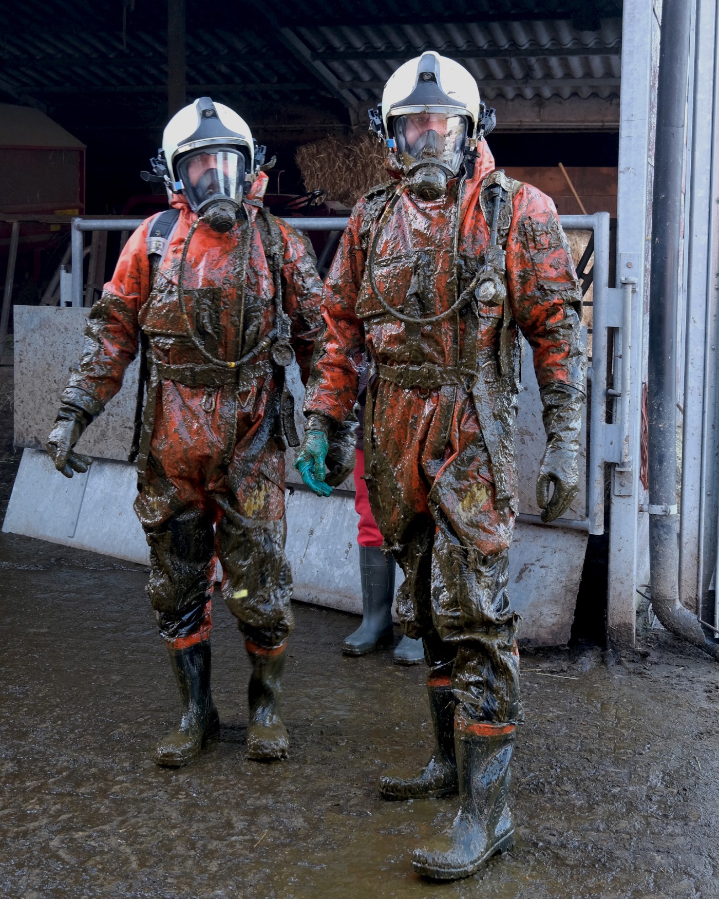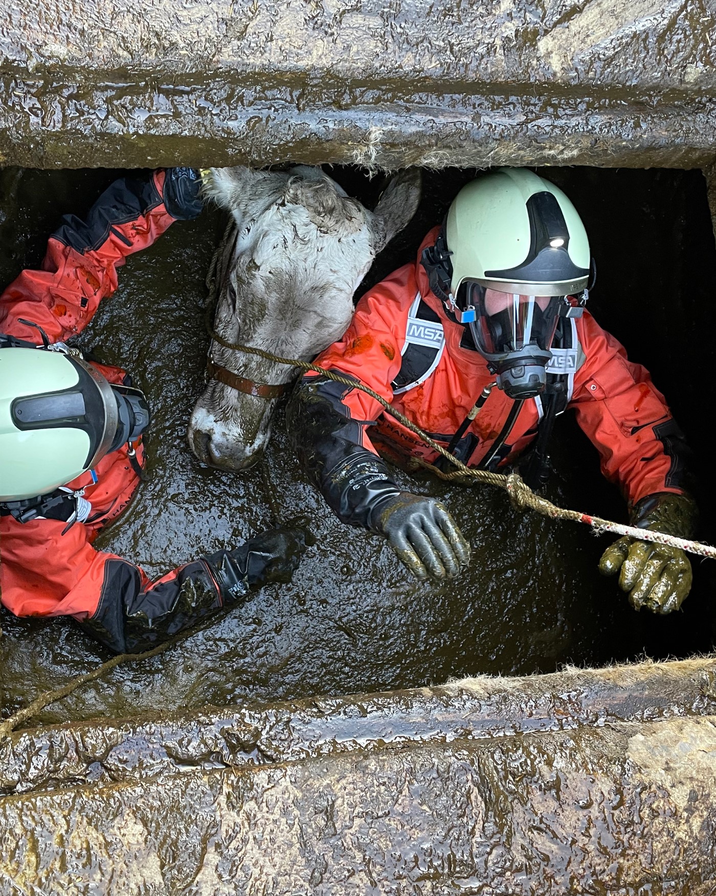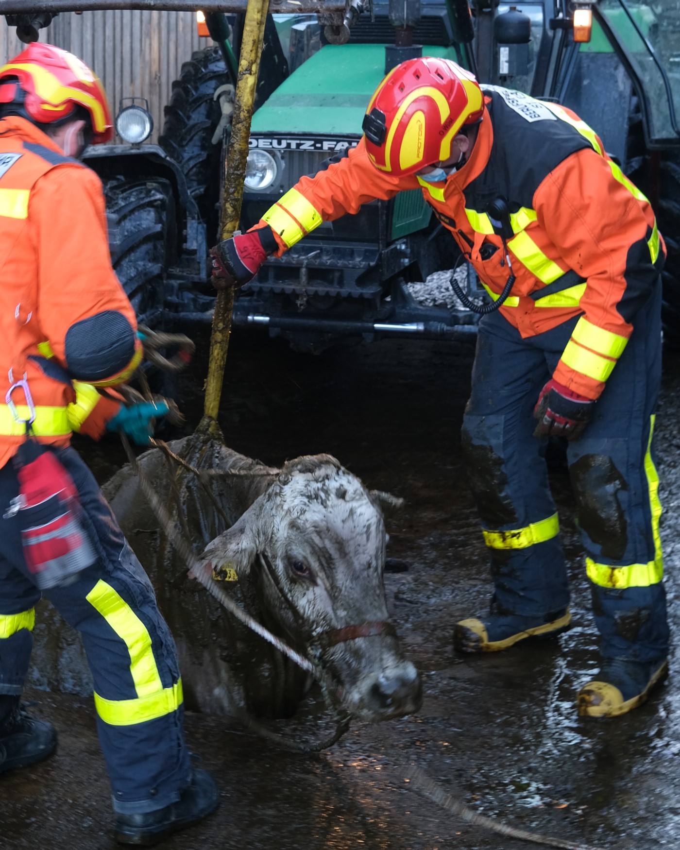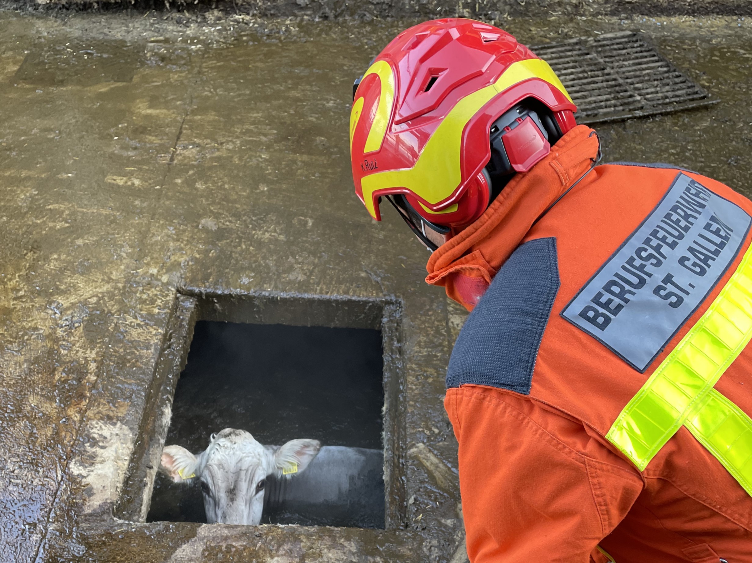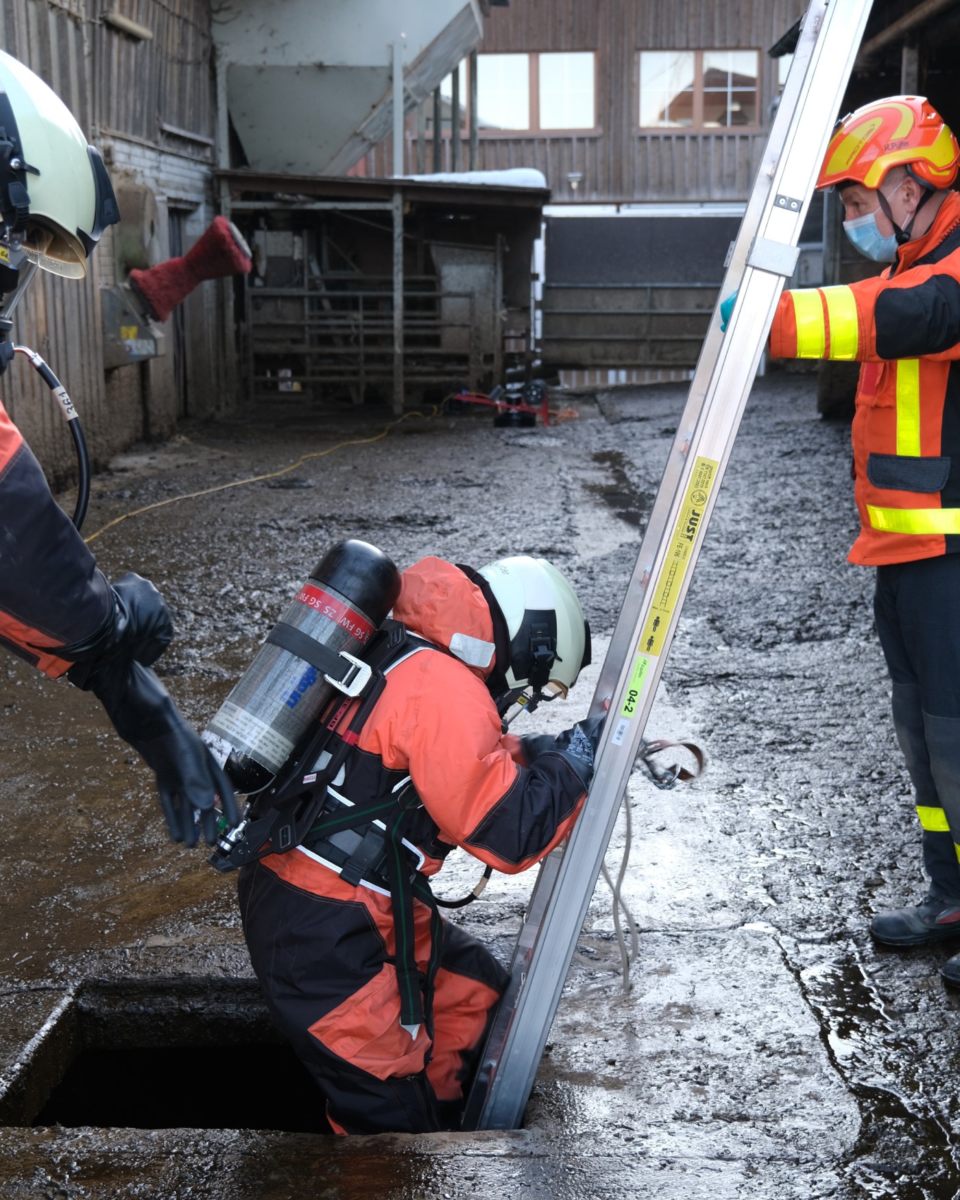 Am Mittwochnachmittag (23.03.2021) wurde die Berufsfeuerwehr zu einem Bauernhof gerufen. Eine Kuh sei in eine Jauchegrube gefallen. Zwei Angehörige der Berufsfeuerwehr sind unter Atemschutz zur Kuh hinabgestiegen und haben ihr zwei Hebegurten umgelegt. Um die Kuh mit genügend Atemluft zu versorgen, wurde die Grube mittels Elektrolüfter belüftet. Danach wurde das Tier mit einem Frontlader und vereinten Kräften aus der Grube hochgezogen. Die Kuh wurde gereinigt und konnte nach einer kurzen Kontrolle von der Tierärztin der Besitzerin übergeben werden.