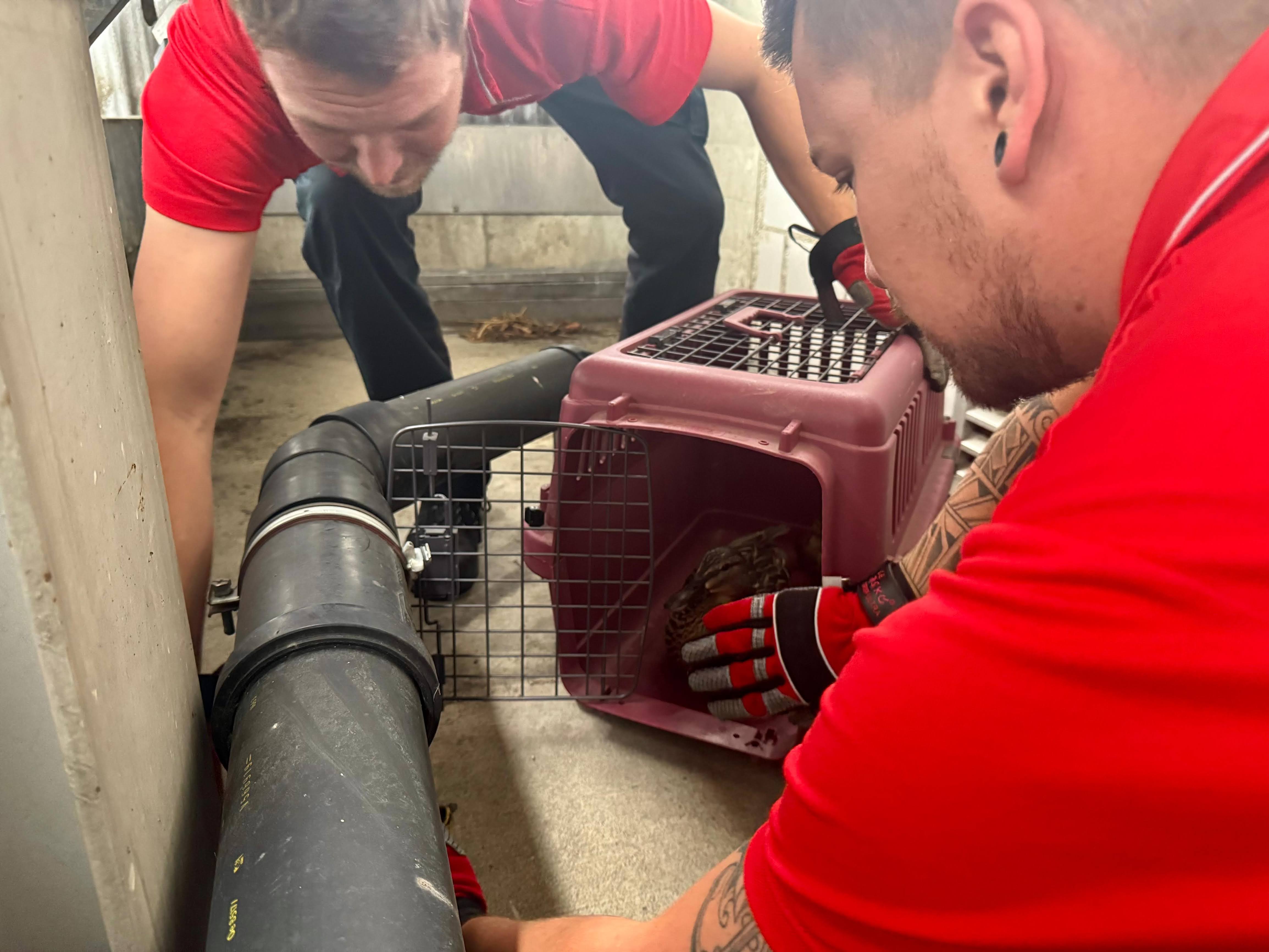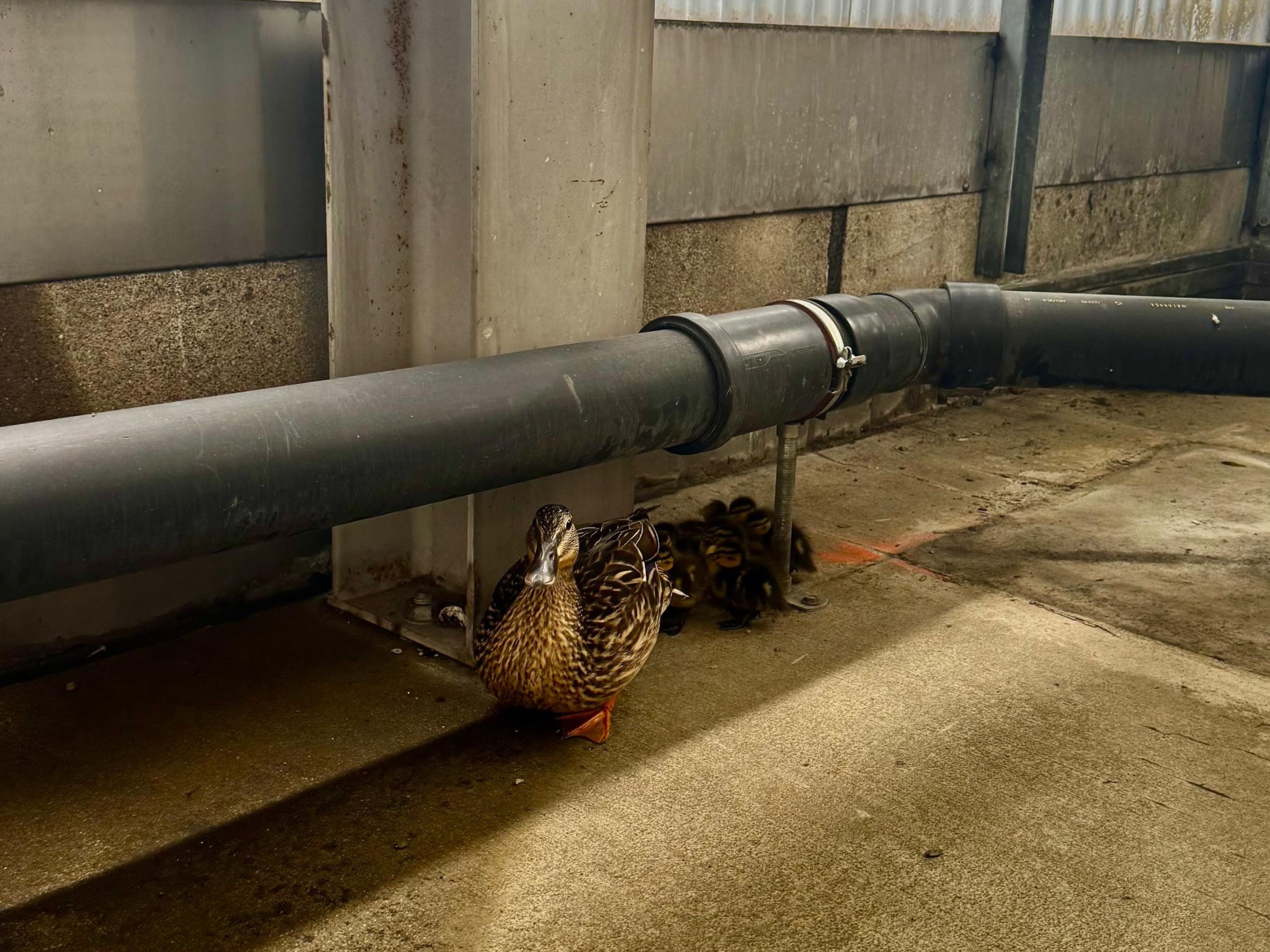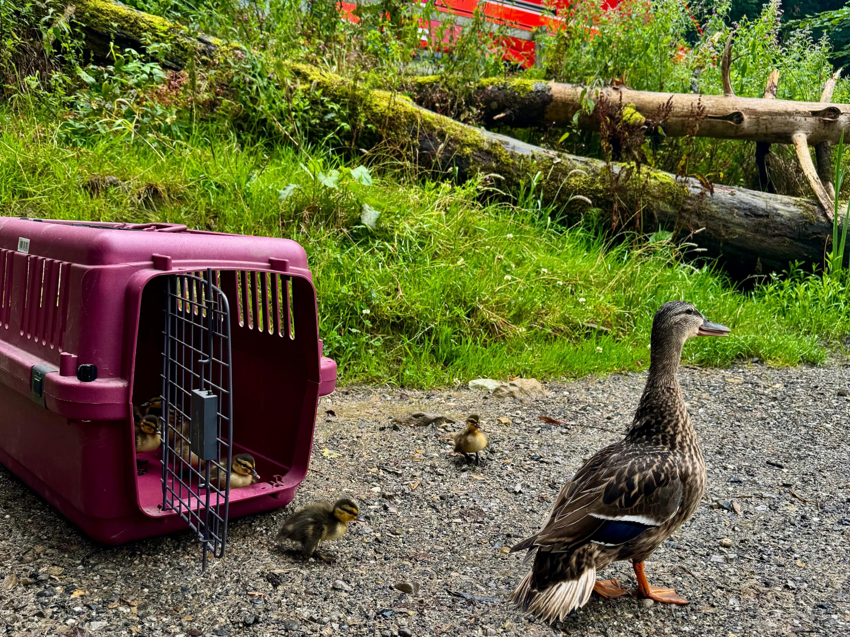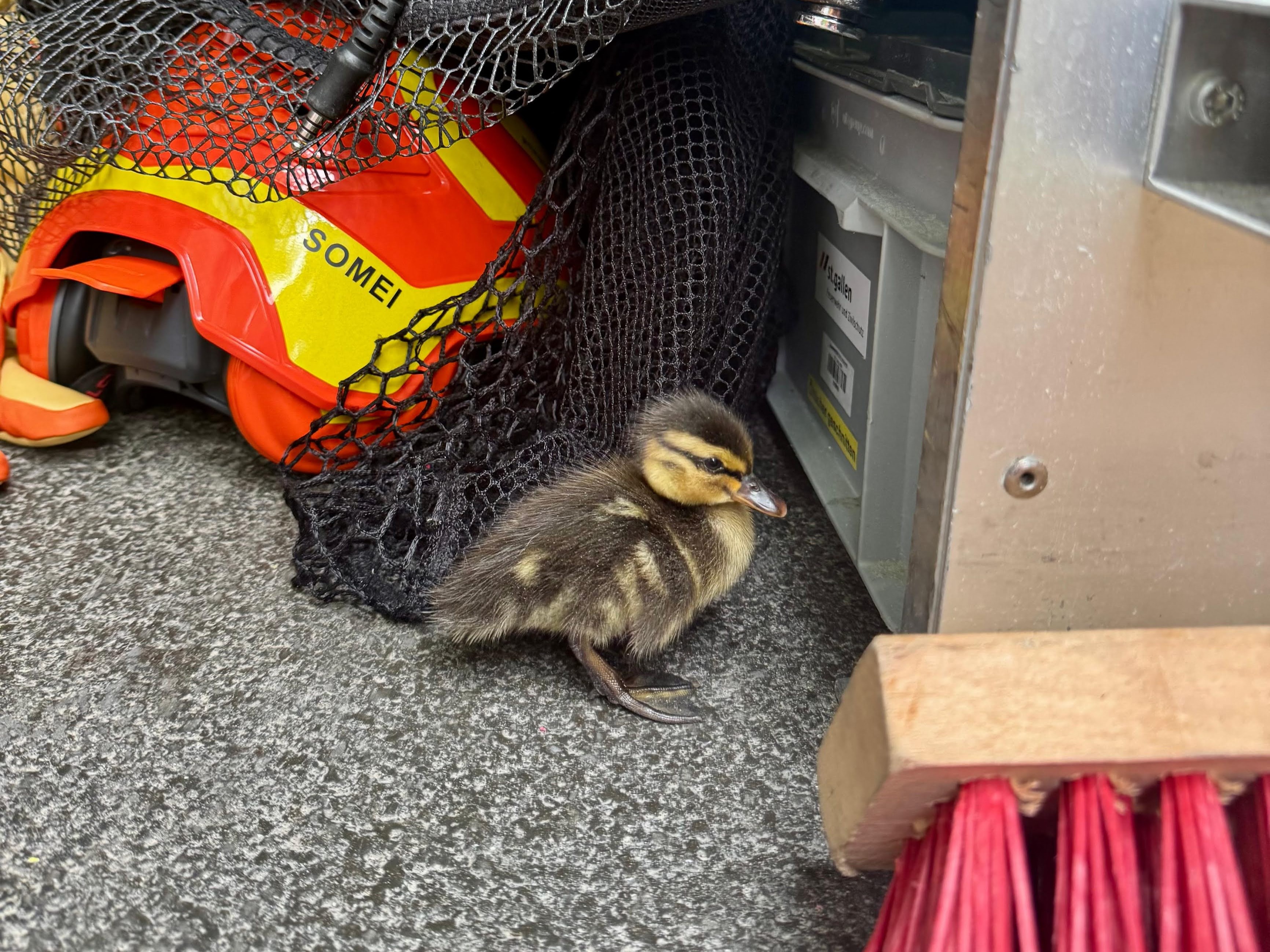 Heute Vormittag haben unsere Berufsfeuerwehrmänner eine Entenmama samt 9 Küken vom Parkdeck eskortiert – natürlich stilecht im tierischen VIP-Shuttle.