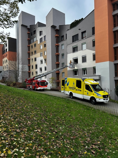 Am Morgen wurde die Berufsfeuerwehr zur Unterstützung des Rettungsdienstes aufgeboten. Eine verletzte Person musste mit der Autodrehleiter durch das Fenster transportiert werden und konnte anschliessend der Rettung St.Gallen übergeben werden.